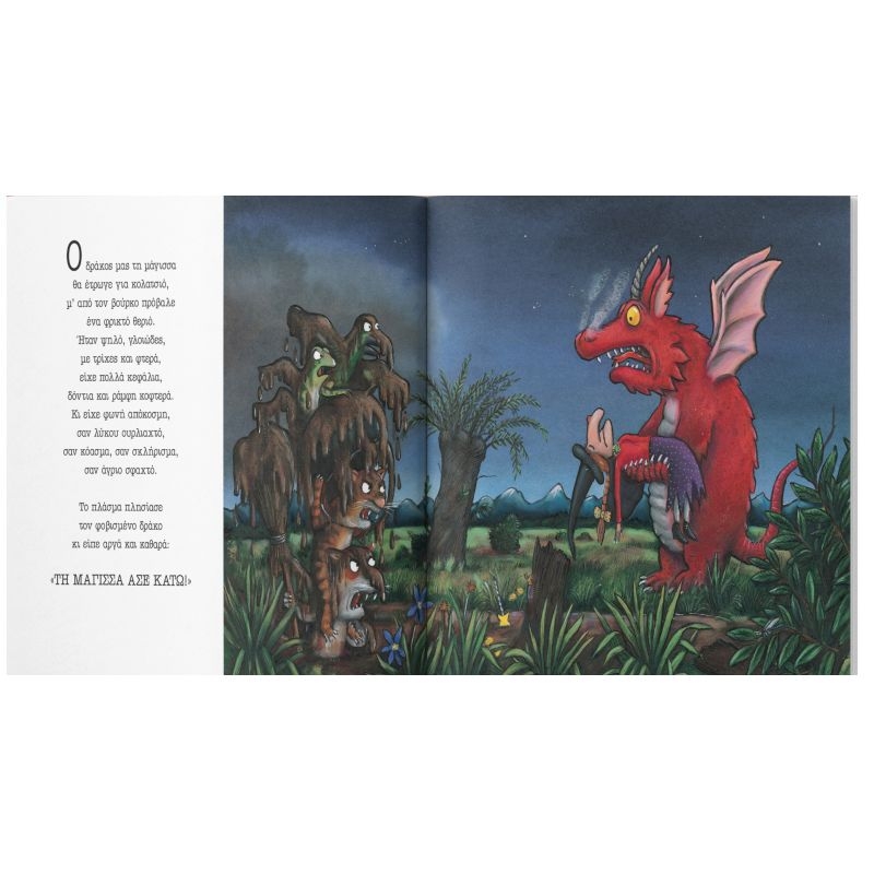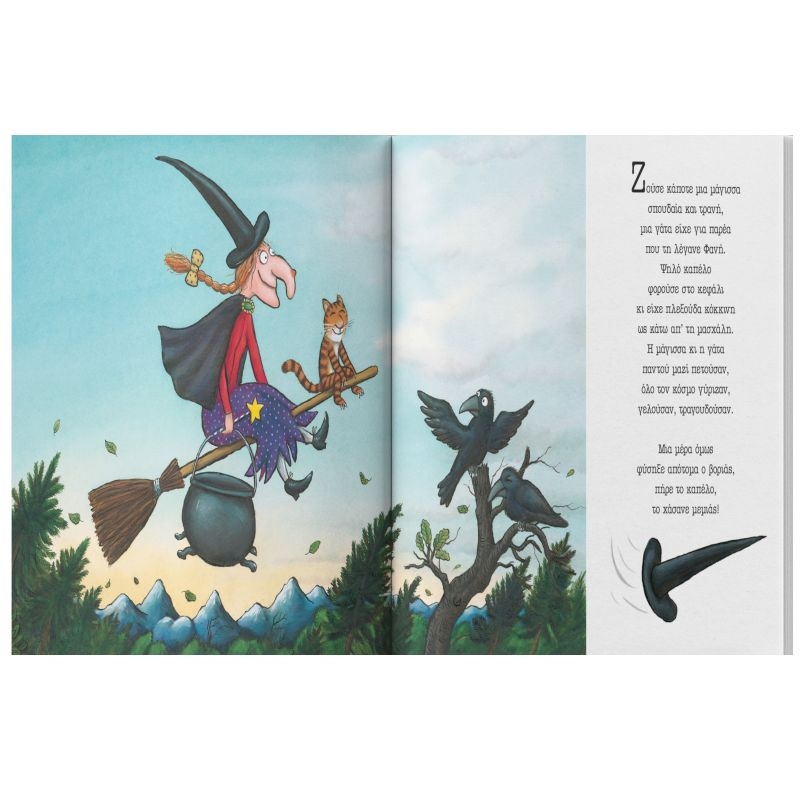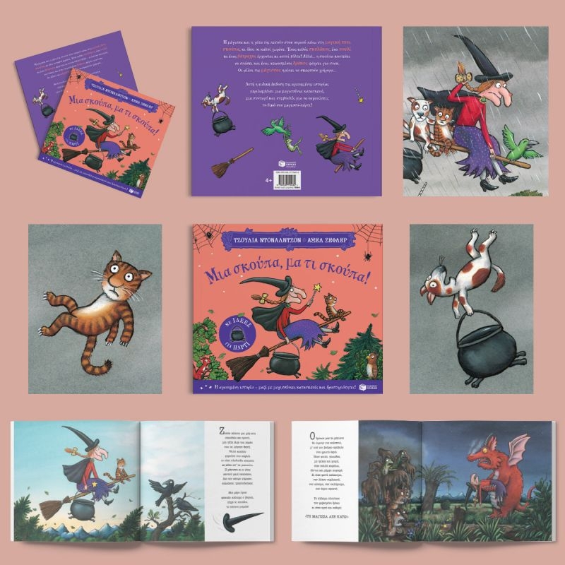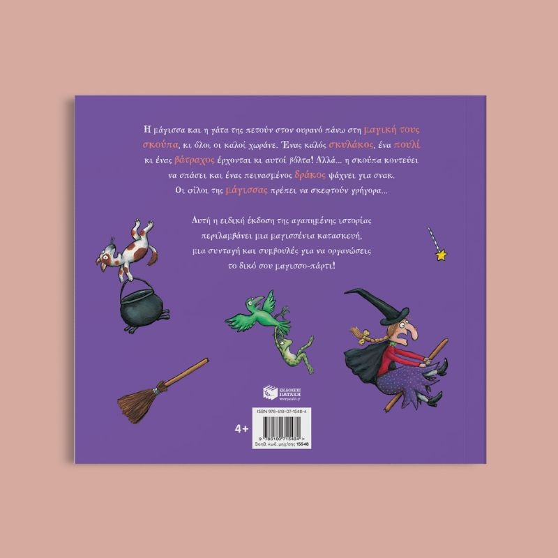 Η μάγισσα και η γάτα της πετούν στον ουρανό πάνω στη μαγική τους σκούπα, κι όλοι οι καλοί χωράνε. Ένας καλός σκυλάκος, ένα πουλί κι ένας βάτραχος έρχονται κι αυτοί βόλτα! Αλλά… η σκούπα κοντεύει να σπάσει και ένας πεινασμένος δράκος ψάχνει για σνακ. Οι φίλοι της μάγισσας πρέπει να σκεφτούν γρήγορα…Αυτή η ειδική έκδοση της αγαπημένης ιστορίας περιλαμβάνει μια μαγισσένια κατασκευή, μια συνταγή και συμβουλές για να οργανώσεις το δικό σου μαγισσο-πάρτι!
