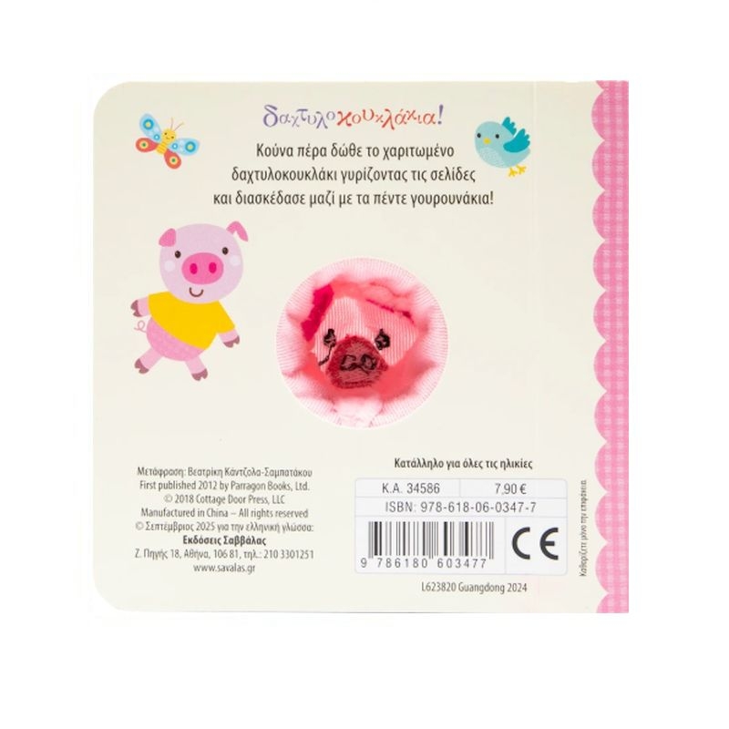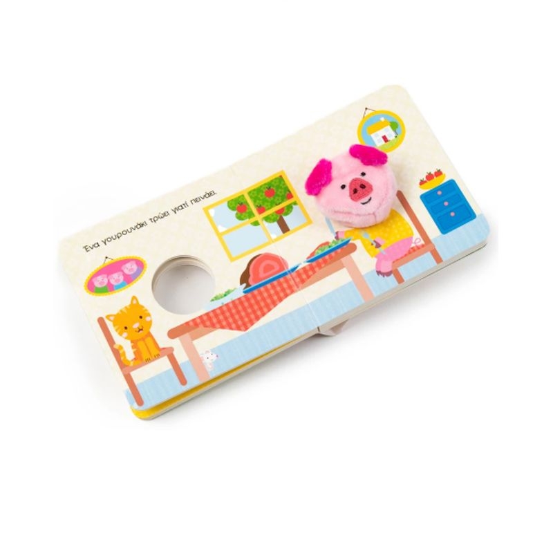 Κούνα πέρα δώθε το χαριτωμένο δαχτυλοκουκλάκι γυρίζοντας τις σελίδες κα διασκέδασε μαζί με τα πέντε γουρουνάκια!