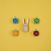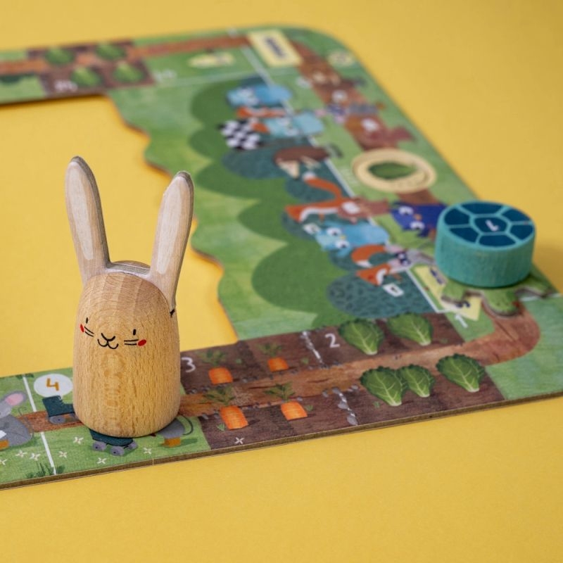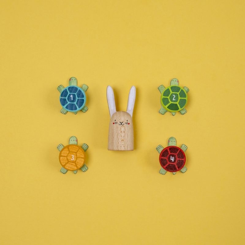Περιλαμβάνει: 1 λαγό, 3 χελώνες, 1 καρότο, 1 μαρούλι, 4 βραβεία/μετάλλια, 1 ζάρι, 1 ταμπλό παιχνιδιού και Οδηγίες παιχνιδιού.