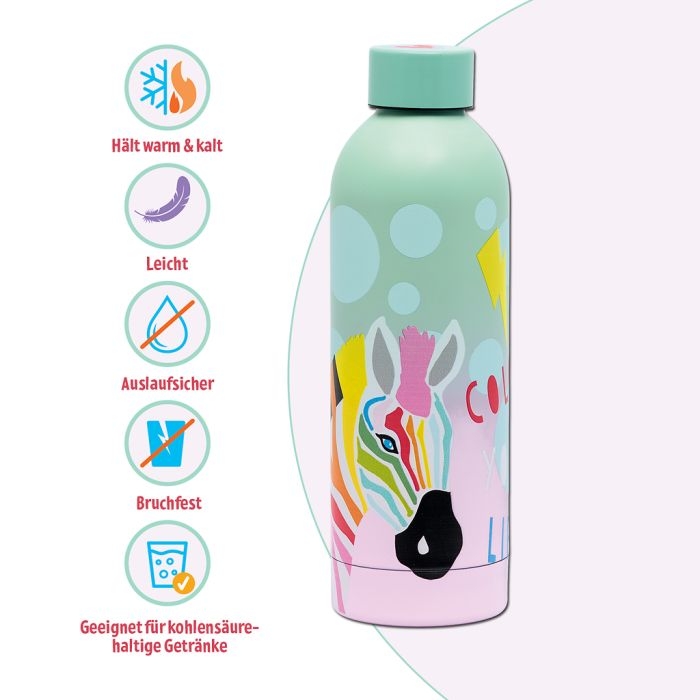 Κρατήστε τα αγαπημένα σας ροφήματα ζεστά έως 12 ώρες ή κρύα έως 15 ώρες με το Lovely Planet θερμός! Με διπλό τοίχωμα από ανοξείδωτο ατσάλι, η φιάλη είναι ανθεκτική, αδιάβροχη και ανθεκτική σε θραύση, ιδανική για καθημερινή χρήση, εκδρομές ή το γραφείο. Κατάλληλη και για αεριούχα ροφήματα. Το χρωματιστό σχέδιο Zebra με τη μικρή καρδιά στο καπάκι προσθέτει μια χαριτωμένη πινελιά και κάνει τη φιάλη να ξεχωρίζει!