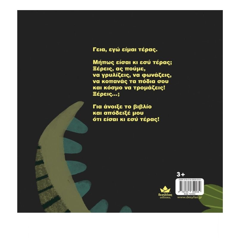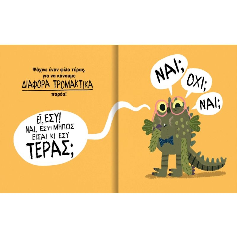Mια ξεκαρδιστική και διαδραστική ιστορία που καλεί τα παιδιά να ανακαλύψουν τον «μικρό τέρας-εαυτό» τους. Ένα υποτιθέμενα γενναίο και πολύ «κακό» τέρας μιλά απευθείας στον αναγνώστη, ρωτώντας τον: «Έχεις μακριά και μυτερή ουρά;», «Μήπως έχεις τεράστια κίτρινα μάτια;», «Μπορείς να γρυλίσεις δυνατά;». Όμως, όσο η ιστορία προχωρά, αποκαλύπτεται ότι ίσως ο μικρός αναγνώστης είναι το πιο τρομακτικό τέρας από όλα! Μέσα από χιούμορ, ανατροπές και θεατρικό ρυθμό, το βιβλίο βοηθά τα παιδιά να διαχειριστούν τους φόβους τους και να γελάσουν με αυτούς. Η αφήγηση είναι άμεση, ζωντανή και γεμάτη ήχους (ΓΚΡΡΡ, ΡΑΑΑΡΡΡ), κάνοντας την ανάγνωση διαδραστική και ιδανική για θεατρικό παιχνίδι. Τα παιδιά συμμετέχουν ενεργά στην ιστορία, απαντούν, κάνουν ήχους και κινήσεις, ενώ στο τέλος ανακαλύπτουν ότι ακόμα και τα πιο «τρομερά» τέρατα… χρειάζονται φίλους.