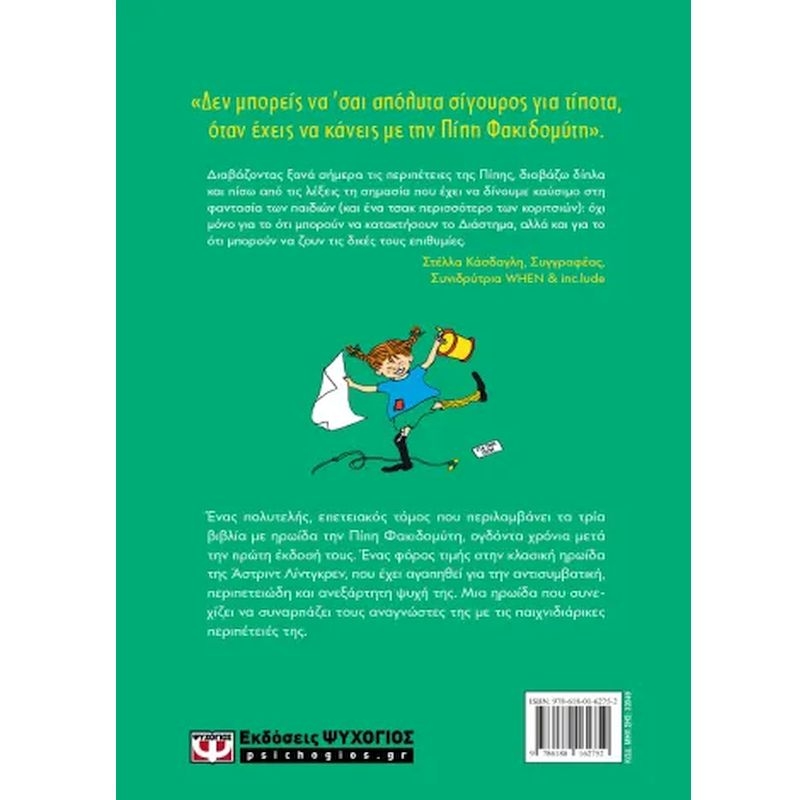 Δεν μπορείς να ’σαι απόλυτα σίγουρος για τίποτα, όταν έχεις να κάνεις με την Πίπη Φακιδομύτη». Διαβάζοντας ξανά σήμερα τις περιπέτειες της Πίπης, διαβάζω δίπλα και πίσω από τις λέξεις τη σημασία που έχει να δίνουμε καύσιμο στη φαντασία των παιδιών (και ένα τσακ περισσότερο των κοριτσιών): όχι μόνο για το ότι μπορούν να κατακτήσουν το Διάστημα, αλλά και για το ότι μπορούν να ζουν τις δικές τους επιθυμίες. Ένας πολυτελής, επετειακός τόμος που περιλαμβάνει τα τρία βιβλία με ηρωίδα την Πίπη Φακιδομύτη, ογδόντα χρόνια μετά την πρώτη έκδοσή τους. Ένας φόρος τιμής στην κλασική ηρωίδα της Άστριντ Λίντγκρεν, που έχει αγαπηθεί για την αντισυμβατική, περιπετειώδη και ανεξάρτητη ψυχή της. Μια ηρωίδα που συνεχίζει να συναρπάζει τους αναγνώστες της με τις παιχνιδιάρικες περιπέτειές της.