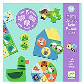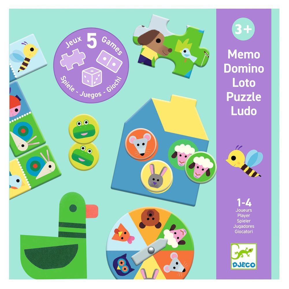 Σετ κλασικών εκπαιδευτικών παιχνιδιών από την εταιρεία Djeco, που συγκεντρώνει πέντε αγαπημένες δραστηριότητες σε μία συσκευασία: memory, lotto, ντόμινο, παζλ και παιχνίδι με ζάρι. Ένα ολοκληρωμένο σετ που χαρίζει στα παιδιά ώρες διασκέδασης, ενώ ταυτόχρονα ενισχύει τη λογική σκέψη, τη μνήμη και την παρατηρητικότητα. Με πολύχρωμες εικονογραφήσεις από χαριτωμένα ζωάκια της φάρμας, κάθε παιχνίδι γίνεται μια νέα ευκαιρία για δημιουργική μάθηση και παιχνίδι με την οικογένεια.