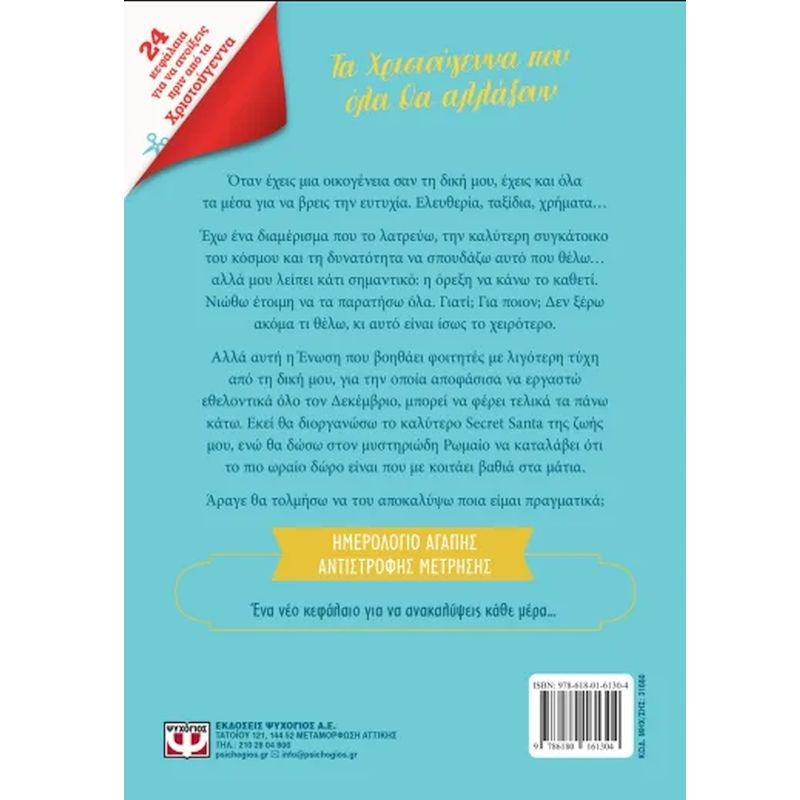 Όταν έχεις μια οικογένεια σαν τη δική μου, έχεις και όλα τα μέσα για να βρεις την ευτυχία. Ελευθερία, ταξίδια, χρήματα… Έχω ένα διαμέρισμα που το λατρεύω, την καλύτερη συγκάτοικο του κόσμου και τη δυνατότητα να σπουδάζω αυτό που θέλω… αλλά μου λείπει κάτι σημαντικό: η όρεξη να κάνω το καθετί. Νιώθω έτοιμη να τα παρατήσω όλα. Γιατί; Για ποιον; Δεν ξέρω ακόμα τι θέλω, κι αυτό είναι ίσως το χειρότερο. Αλλά αυτή η Ένωση που βοηθάει φοιτητές με λιγότερη τύχη από τη δική μου, για την οποία αποφάσισα να εργαστώ εθελοντικά όλο τον Δεκέμβριο, μπορεί να φέρει τελικά τα πάνω κάτω. Εκεί θα διοργανώσω το καλύτερο Secret Santa της ζωής μου, ενώ θα δώσω στον μυστηριώδη Ρωμαίο να καταλάβει ότι το πιο ωραίο δώρο είναι που με κοιτάει βαθιά στα μάτια.