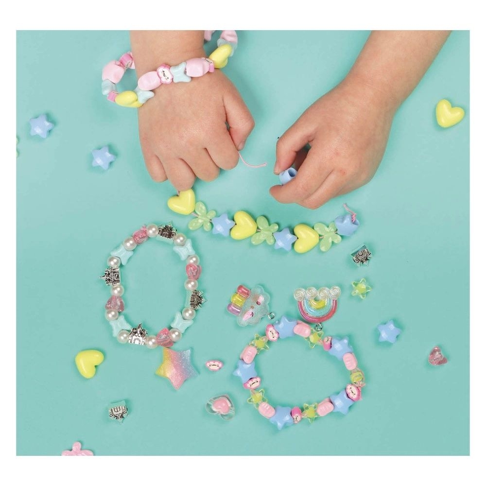 Περιλαμβάνει: Πάνω από 230 πολύχρωμες χάντρες με μεγάλα ανοίγματα για εύκολο πιάσιμο, 3 μοναδικά charms για πρωτότυπα κοσμήματα, ειδικό ελαστικό νήμα και οδηγίες.