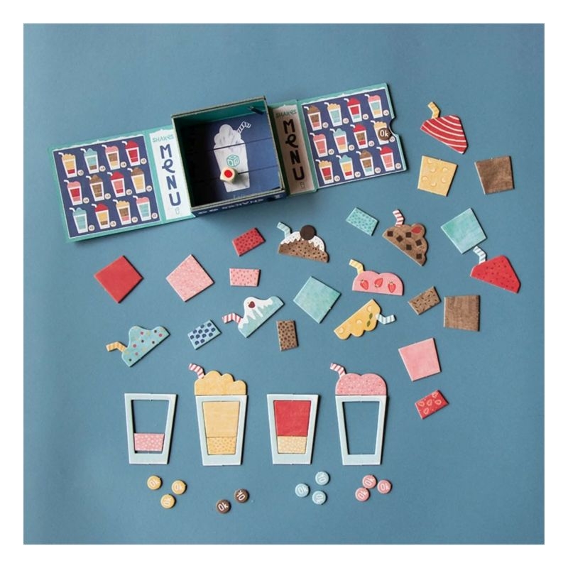 Περιλαμβάνει: 1 χρωματιστό ζάρι, 4 ποτήρια milkshake, 30 κομμάτια milkshake (πάνω, μέση, κάτω), 12 μετρητές "ok" (3 για κάθε παίκτη), 1 κουτί με μενού milkshake (με πτερύγια για να κυλάει το ζάρι).
