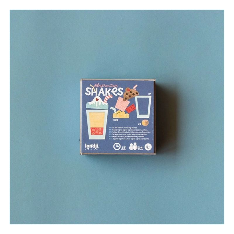 Ταχύτητα, παρατήρηση και γλυκές νίκες σε ένα μικρό κουτί! Ένα μικρό παιχνίδι γεμάτο χρώματα, γεύσεις και ένταση – ποιος θα φτιάξει το πρώτο milkshake; Με τη νέα σειρά Tiny Games, η Londji φέρνει μικρά παιχνίδια για μεγάλες περιπέτειες! Χωράνε στην τσέπη σας και σας ακολουθούν παντού. Όπου κι αν πάτε, η διασκέδαση είναι πάντα μαζί σας! Μια φορά κι έναν καιρό… υπήρχε ένα μαγαζί milkshake γεμάτο γεύσεις και χρώματα. Ποιος θα καταφέρει να ανακατέψει τα υλικά πιο γρήγορα και να ολοκληρώσει πρώτος τους 3 milkshakes; Το Shakes είναι ένα γρήγορο και διασκεδαστικό παιχνίδι παρατήρησης για παιδιά από 5 ετών. Οι παίκτες πρέπει να ψάξουν για τα σωστά κομμάτια, να τα βάλουν στο κύπελλο τους και να ολοκληρώσουν τα milkshakes πριν τους προλάβουν οι αντίπαλοι!
