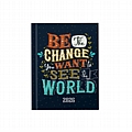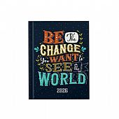 Πρόκειται για ένα ημερήσιο ημερολόγιο του 2026 με εμπνευσμένο εξώφυλλο σε σκούρο μπλε φόντο και πολύχρωμη, καλλιγραφική φράση: "Be the change you want to see in the world" (Γίνε η αλλαγή που θέλεις να δεις στον κόσμο). Ο σχεδιασμός του είναι χαρούμενος και αισιόδοξος, με διακοσμητικά στοιχεία και παιχνιδιάρικα γράμματα που το καθιστούν ιδανικό για καθημερινή χρήση, προσφέροντας έμπνευση και θετική ενέργεια.