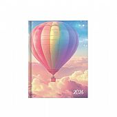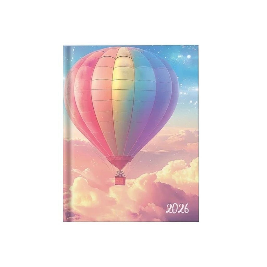 Ημερολόγιο 2026 με σκληρό εξώφυλλο που απεικονίζει ένα πολύχρωμο αερόστατο να πετά πάνω από ροζ και χρυσά σύννεφα σε ονειρικό φόντο. Διαθέτει κομψό και φωτεινό σχεδιασμό, ιδανικό για καθημερινή οργάνωση και έμπνευση.