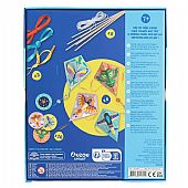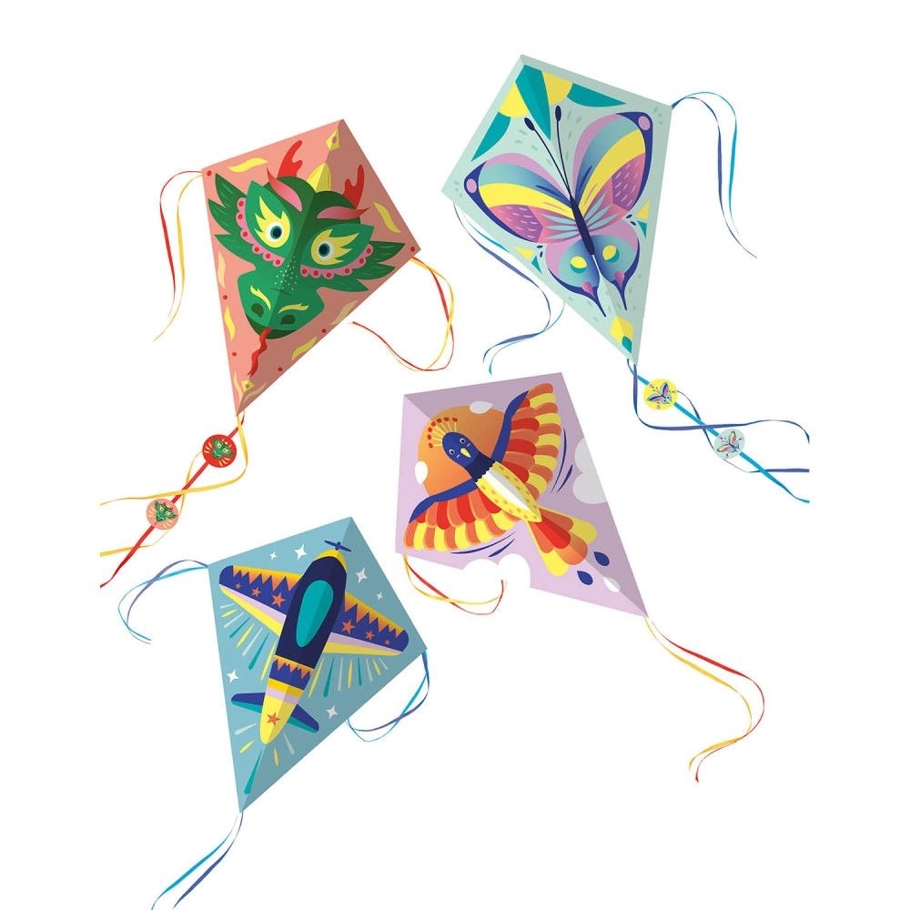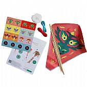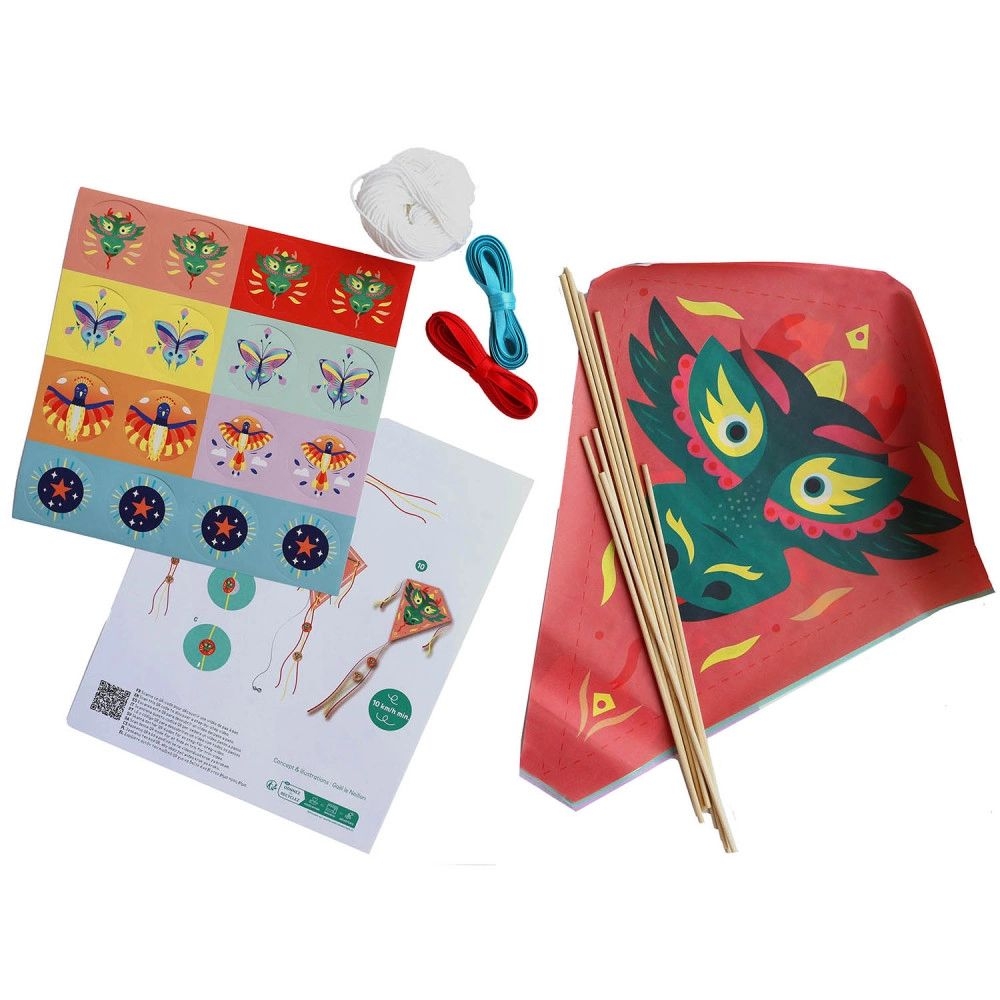 Περιλαμβάνει: 4 σχέδια χαρταετών, 8 ξύλινα μπαστούνια, 3 χρώματα κορδέλας, σχοινί για την πτήση αυτοκόλλητα για διακόσμηση και οδηγίες για την κατασκευή,