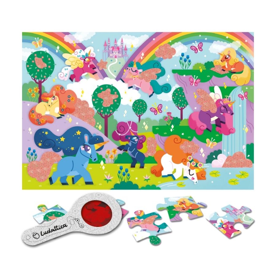 Αυτό το παιχνίδι περιλαμβάνει ένα παζλ 24 κομματιών με θέμα τους μονόκερους και έναν πρωτότυπο φακό για ακόμα περισσότερη διασκέδαση! Το παιδί συνθέτει το παζλ και στη συνέχεια χρησιμοποιεί τον φακό για να ανακαλύψει μικρές λεπτομέρειες που κρύβονται μέσα στην εικόνα. Ένα διασκεδαστικό παιχνίδι που ενδυναμώνει τις λεπτές κινητικές δεξιότητες, ενισχύει την περιέργεια και την παρατηρητικότητα, ενώ παράλληλα ενισχύει τη συγκέντρωση του παιδιού.