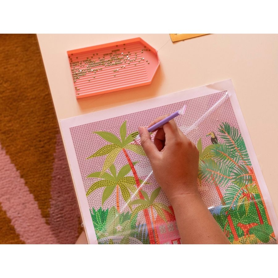 Περιλαμβάνει: 1 καμβά με τυπωμένο και αυτοκόλλητο σχέδιο (30 x 40 εκ.), 1 στυλό diamond painting με 5 διαφορετικά άκρα, Πολύχρωμα διαμαντάκια σε σακουλάκια, Πλάκες κόλλας, 2 ξύλινες βέργες για κρέμασμα και Οδηγίες με συνέντευξη της εικονογράφου Maja Tomljanovic.