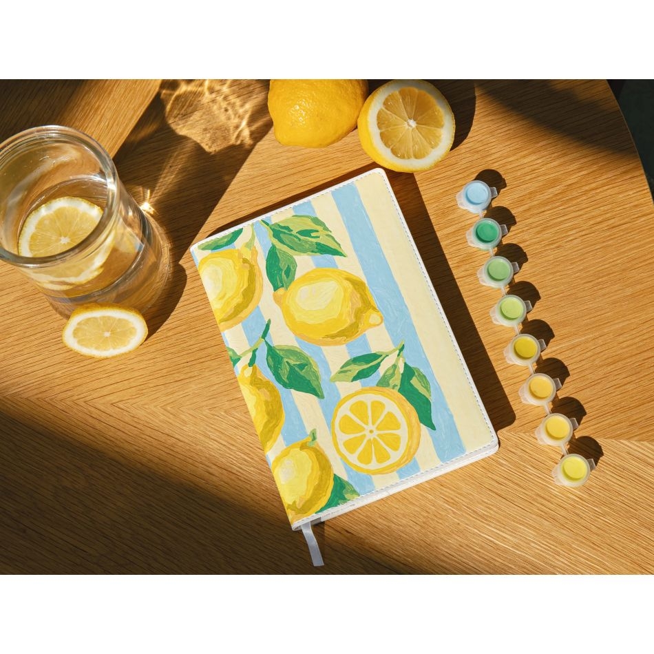 Το Citrons αποπνέει ήλιο, καλοκαίρι και γλυκύτητα στη ζωή. Εμπνευσμένο από τις αγορές του νότου και τα φωτεινά απογεύματα, σας προσκαλεί να ζωγραφίσετε ένα χαρούμενο και γεμάτο ενέργεια μοτίβο. Οι κίτρινες και χρυσές αποχρώσεις αναμειγνύονται με ελαφρότητα για να δημιουργήσουν μια φωτεινή, απλή αλλά κομψή σύνθεση. Μόλις ολοκληρωθεί η ζωγραφική του αφαιρούμενου εξωφύλλου, το σημειωματάριο γίνεται ένα όμορφο αντικείμενο γραφής, ιδανικό να κρατηθεί ή να προσφερθεί σε αγαπημένο πρόσωπο.