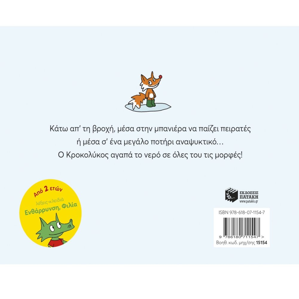 Κάτω απ’ τη βροχή, μέσα στην μπανιέρα να παίζει πειρατές ή μέσα σ’ ένα μεγάλο ποτήρι αναψυκτικό…Ο Κροκολύκος αγαπά το νερό σε όλες του τις μορφές! Σήμερα βρέχει. Φορώντας μπότες και αδιάβροχο, ο Κροκολύκος διασκεδάζει χοροπηδώντας στις λακκούβες. Έπειτα πηγαίνει στο κολυμβητήριο μαζί με τη Λιλίκα και τον Νώε: το νερό είναι φανταστικό και το κολύμπι πολύ ευχάριστο. Αλλά και το βράδυ, ο Κροκολύκος ένα πράγμα θέλει μόνο: να κάνει το μπάνιο του! Δε σταματά να παίζει στο νερό…Ο Κροκολύκος είναι και κροκόδειλος και λύκος, μα πάνω απ’ όλα είναι παιδί. Ένα παιδί που αγαπά το γέλιο και το παιχνίδι, τη δράση και την περιπέτεια, τους φίλους, την οικογένεια, τη δασκάλα, το κέικ σοκολάτα… Ο Κροκολύκος είναι ένα παιδί μοναδικό… σαν όλα τα παιδιά! Μια υπέροχη σειρά βιβλίων για μικρά παιδιά, σε κείμενο και εικονογράφηση της Οφελί Τεξιέ.