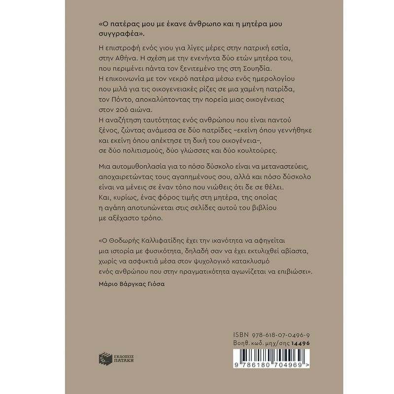 «Ο πατέρας µου µε έκανε άνθρωπο και η µητέρα µου συγγραφέα». Η επιστροφή ενός γιου για λίγες µέρες στην πατρική εστία, στην Αθήνα. Η σχέση µε την ενενήντα δύο ετών µητέρα του, που περιµένει πάντα τον ξενιτεµένο της στη Σουηδία. Η επικοινωνία µε τον νεκρό πατέρα µέσω ενός ηµερολογίου που µιλά για τις οικογενειακές ρίζες σε µια χαµένη πατρίδα, τον Πόντο, αποκαλύπτοντας την πορεία µιας οικογένειας στον 20ό αιώνα. Η αναζήτηση ταυτότητας ενός ανθρώπου που είναι παντού ξένος, ζώντας ανάµεσα σε δύο πατρίδες –εκείνη όπου γεννήθηκε και εκείνη όπου απέκτησε τη δική του οικογένεια–, σε δύο πολιτισµούς, δύο γλώσσες και δύο κουλτούρες. Μια αυτοµυθοπλασία για το πόσο δύσκολο είναι να µεταναστεύεις, αποχαιρετώντας τους αγαπηµένους σου, αλλά και πόσο δύσκολο είναι να µένεις σε έναν τόπο που νιώθεις ότι δε σε θέλει. Και, κυρίως, ένας φόρος τιµής στη µητέρα, της οποίας η αγάπη αποτυπώνεται στις σελίδες αυτού του βιβλίου µε αξέχαστο τρόπο. «Ο Θοδωρής Καλλιφατίδης έχει την ικανότητα να αφηγείται µια ιστορία µε φυσικότητα, δηλαδή σαν να έχει εκτυλιχθεί αβίαστα, χωρίς να ασφυκτιά µέσα στον ψυχολογικό κατακλυσµό ενός ανθρώπου που στην πραγµατικότητα αγωνίζεται να επιβιώσει». Μάριο Βάργκας Γιόσα.