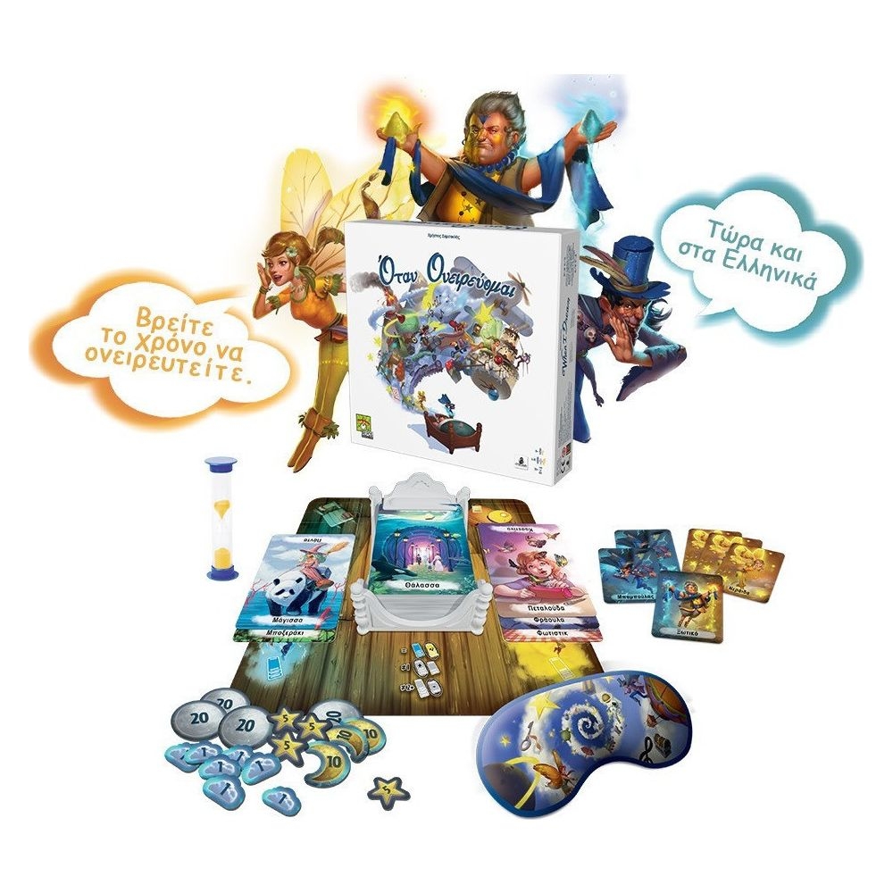 Βρείτε λίγο χρόνο… να ονειρευτείτε! Στο When I Dream, οι παίκτες βουτούν σε έναν κόσμο φαντασίας, όπου λέξεις, εικόνες και μυστήρια μπλέκονται σε ένα απολαυστικό παιχνίδι πάρτι. Σε κάθε γύρο, ένας παίκτης γίνεται ο Ονειρευτής, φοράει τη μάσκα ύπνου και αφήνεται στα χέρια των υπόλοιπων παικτών που παίζουν τον ρόλο των Πνευμάτων του Ονείρου. Κάθε πνεύμα προσπαθεί να περιγράψει την ίδια κάρτα με μία μόνο λέξη, αλλά όχι όλοι με τον ίδιο σκοπό!