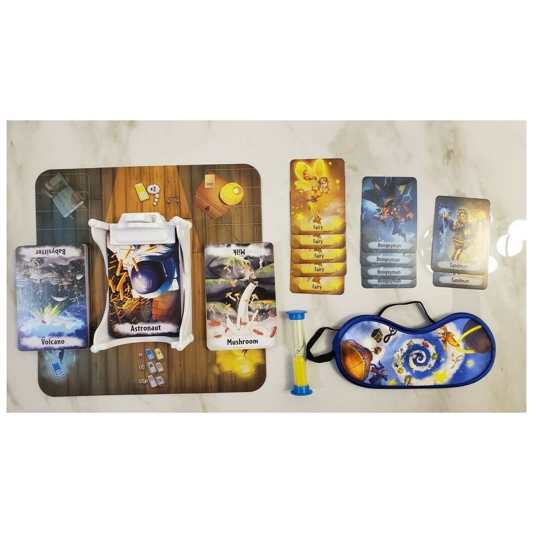 Περιλαμβάνει: 1 κρεβάτι – βάση για τις κάρτες, 1 ταμπλό, 1 μάσκα ύπνου, 1 κλεψύδρα, 110 κάρτες ονείρου, 440 στοιχεία, 11 κάρτες ρόλων, 104 μάρκες πόντων και οδηγίες.
