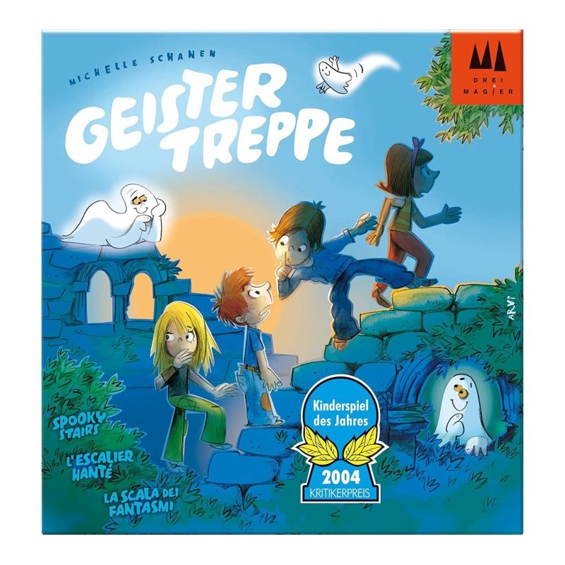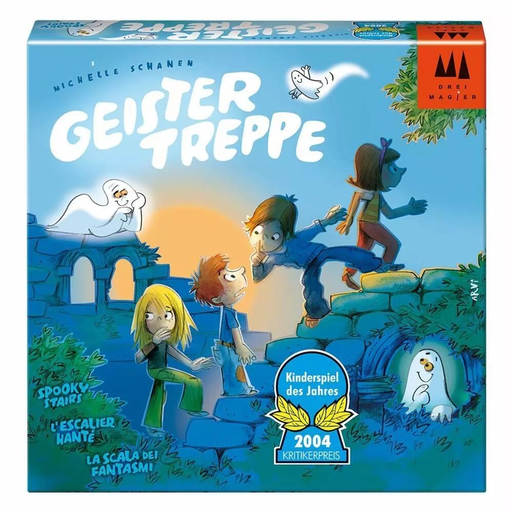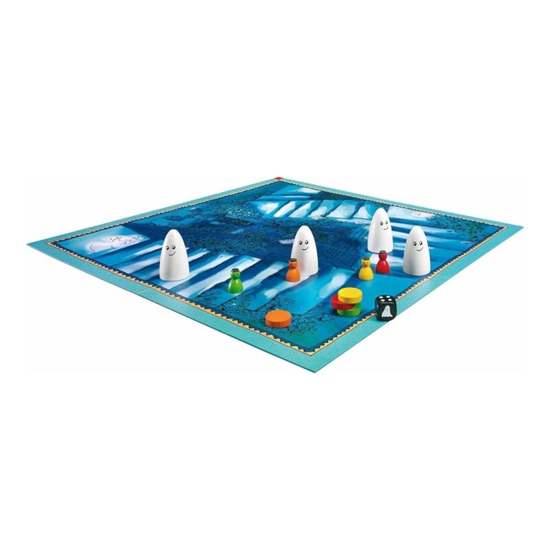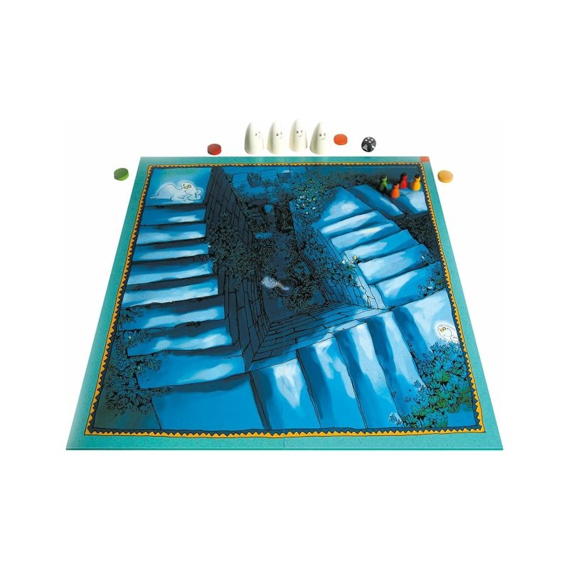 Στο μυστηριώδες κάστρο, τα «Σκαλιά των Φαντασμάτων» κρύβουν μια διασκεδαστική πρόκληση! Τα πιο τολμηρά παιδιά τρέχουν να φτάσουν πρώτα στην κορυφή, όπου κατοικεί το παλιό φάντασμα, έτοιμα να το τρομάξουν με ένα δυνατό «BOOOO!». Όμως προσοχή: το φάντασμα γνωρίζει το παιχνίδι και κάθε γύρο μπορεί να μεταμορφώσει τους παίκτες σε… φαντάσματα! Κάθε φορά που ένας παίκτης ρίχνει τον μαγικό ζάρι, ανεβαίνει σκαλί-σκαλί. Αν εμφανιστεί «φάντασμα», μπορεί να καλύψει τη φιγούρα ενός άλλου παίκτη με μια φαντασμαγορική φιγούρα, η οποία συνδέεται μαγνητικά – και τώρα οι παίκτες πρέπει να θυμούνται ποια φιγούρα τους ανήκει! Αν όλοι έχουν μετατραπεί σε φαντάσματα και εμφανιστεί ξανά «φάντασμα», τότε δύο φιγούρες ανταλλάσσονται. Όποιος καταφέρει να φτάσει πρώτος στην κορυφή, ξεπερνώντας το χάος, κερδίζει!