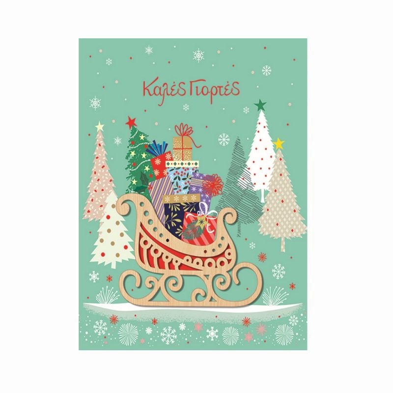 Χριστουγεννιάτικη Κάρτα με Ξύλινο Στολίδι & Φάκελο - Χριστουγεννιάτικο Έλκηθρο με Δώρα (10.5x11.3) - FunCreations
