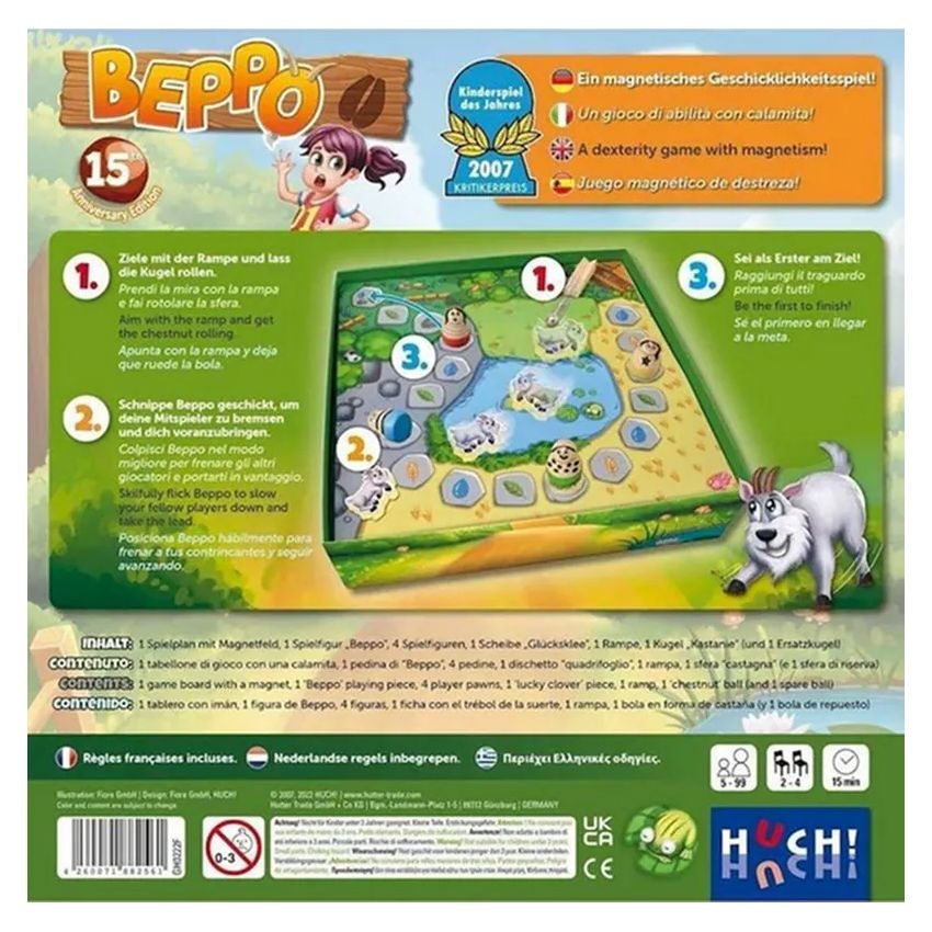 Το παιχνίδι Beppo τιμήθηκε με το βραβείο «Παιδικό Παιχνίδι της Χρονιάς» το 2007 και γρήγορα κέρδισε τις καρδιές μικρών και μεγάλων παικτών. Κάθε παίκτης ελέγχει μια ξύλινη φιγούρα και προσπαθεί να φτάσει στο τελευταίο τετράγωνο της διαδρομής. Ωστόσο, ο τράγος Beppo, που εκπροσωπείται επίσης από ξύλινο πιόνι, ξεκουράζεται στα χωράφια και δεν πρέπει να ενοχληθεί. Στη σειρά του, ο παίκτης τοποθετεί τον Beppo πάνω σε έναν ισχυρό μαγνήτη και στη συνέχεια στέλνει μια μικρή μεταλλική μπάλα προς την κατεύθυνσή του. Αν η μπάλα συναντήσει τον Beppo, αυτός κλωτσά τις φιγούρες των παικτών μακριά, επιστρέφοντάς τες στην αρχή της διαδρομής. Το σημείο στο οποίο θα καταλήξει ο Beppo καθορίζει πόσο μακριά μπορεί να μετακινήσει ο ενεργός παίκτης το πιόνι του. Με επιδεξιότητα και στρατηγική, οι παίκτες προσπαθούν να φτάσουν πρώτοι στο τέλος, αποφεύγοντας τις εκπλήξεις του μαγνητικού τράγου.