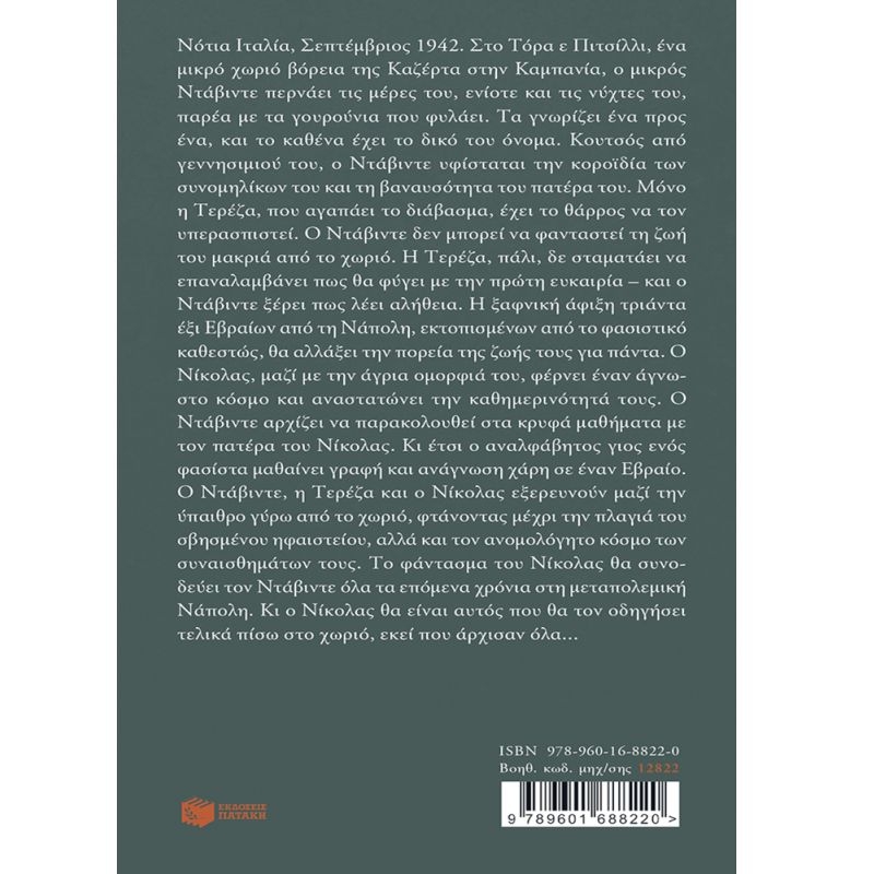 Νότια Ιταλία, Σεπτέµβριος 1942. Στο Τόρα ε Πιτσίλλι, ένα µικρό χωριό βόρεια της Καζέρτα στην Καµπανία, ο µικρός Ντάβιντε περνάει τις µέρες του, ενίοτε και τις νύχτες του, παρέα µε τα γουρούνια που φυλάει. Τα γνωρίζει ένα προς ένα, και το καθένα έχει το δικό του όνοµα. Κουτσός από γεννησιµιού του, ο Ντάβιντε υφίσταται την κοροϊδία των συνοµηλίκων του και τη βαναυσότητα του πατέρα του. Μόνο η Τερέζα, που αγαπάει το διάβασµα, έχει το θάρρος να τον υπερασπιστεί. Ο Ντάβιντε δεν µπορεί να φανταστεί τη ζωή του µακριά από το χωριό. Η Τερέζα, πάλι, δε σταµατάει να επαναλαµβάνει πως θα φύγει µε την πρώτη ευκαιρία – και ο Ντάβιντε ξέρει πως λέει αλήθεια. Η ξαφνική άφιξη τριάντα έξι Εβραίων από τη Νάπολη, εκτοπισµένων από το φασιστικό καθεστώς, θα αλλάξει την πορεία της ζωής τους για πάντα. Ο Νίκολας, µαζί µε την άγρια οµορφιά του, φέρνει έναν άγνωστο κόσµο και αναστατώνει την καθηµερινότητά τους. Ο Ντάβιντε αρχίζει να παρακολουθεί στα κρυφά µαθήµατα µε τον πατέρα του Νίκολας. Κι έτσι ο αναλφάβητος γιος ενός φασίστα µαθαίνει γραφή και ανάγνωση χάρη σε έναν Εβραίο. O Ντάβιντε, η Τερέζα και ο Νίκολας εξερευνούν µαζί την ύπαιθρο γύρω από το χωριό, φτάνοντας µέχρι την πλαγιά του σβησµένου ηφαιστείου, αλλά και τον ανοµολόγητο κόσµο των συναισθηµάτων τους. Το φάντασµα του Νίκολας θα συνοδεύει τον Ντάβιντε όλα τα επόµενα χρόνια στη µεταπολεµική Νάπολη. Kι ο Νίκολας θα είναι αυτός που θα τον οδηγήσει τελικά πίσω στο χωριό, εκεί που άρχισαν όλα…