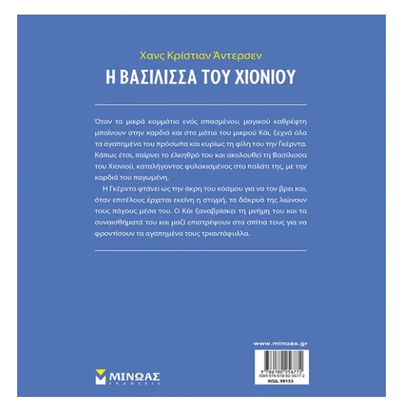 Όταν τα μικρά κομμάτια ενός σπασμένου, μαγικού καθρέφτη μπαίνουν στην καρδιά και στα μάτια του μικρού Κάι, ξεχνά όλα τα αγαπημένα του πρόσωπα και κυρίως τη φίλη του την Γκέρντα. Κάπως έτσι, παίρνει το έλκηθρό του και ακολουθεί τη Βασίλισσα του Χιονιού, καταλήγοντας φυλακισμένος στο παλάτι της, με την καρδιά του παγωμένη. Η Γκέρντα φτάνει ως την άκρη του κόσμου για να τον βρει και, όταν επιτέλους έρχεται εκείνη η στιγμή, τα δάκρυά της λιώνουν τους πάγους μέσα του. Ο Κάι ξαναβρίσκει τη μνήμη του και τα συναισθήματά του και μαζί επιστρέφουν στα σπίτια τους για να φροντίσουν τα αγαπημένα τους τριαντάφυλλα.