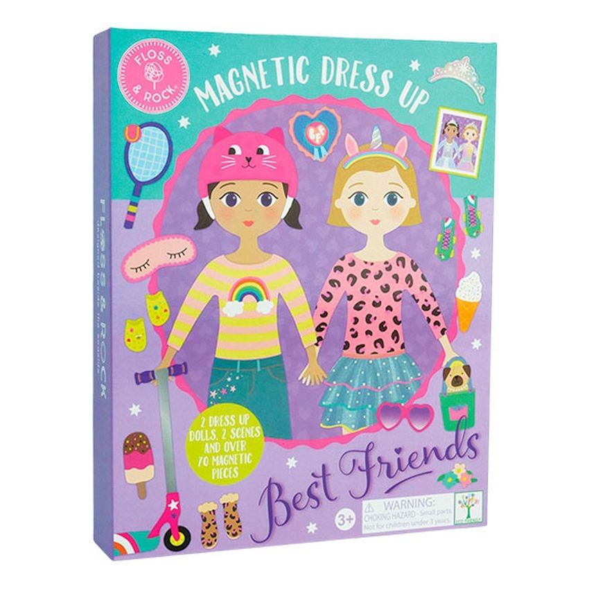 Τα παιδιά θα λατρέψουν αυτό το υπέροχο Μαγνητικό Σετ Ντυσίματος Best Friends από τη Floss & Rock! Το σετ περιλαμβάνει 2 μαγνητικές φιγούρες και περισσότερα από 70 μαγνητικά ρούχα και αξεσουάρ, για να δημιουργούν οι μικροί μας φίλοι αμέτρητους συνδυασμούς και στυλ. Η συσκευασία παρουσιάζει δύο κοριτσάκια κολλητές που μπορούν να ντυθούν με πολύχρωμα outfits, γυαλιά, παπούτσια, στολές για παιχνίδι, ακόμα και αξεσουάρ όπως παγωτά, μάσκες ύπνου, τσάντες και πολλά άλλα. Το σετ περιλαμβάνει επίσης 2 σκηνικά για ακόμα πιο δημιουργικό παιχνίδι ρόλων. Διαθέτει μαγνητικό κλείσιμο, ώστε όλα τα κομμάτια να αποθηκεύονται εύκολα και με ασφάλεια, καθιστώντας το ιδανικό για ταξίδια και παιχνίδι εκτός σπιτιού. Ένα υπέροχο δημιουργικό παιχνίδι που ενισχύει τη φαντασία, τη λεπτή κινητικότητα και το ελεύθερο δημιουργικό παιχνίδι!