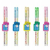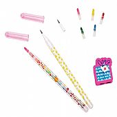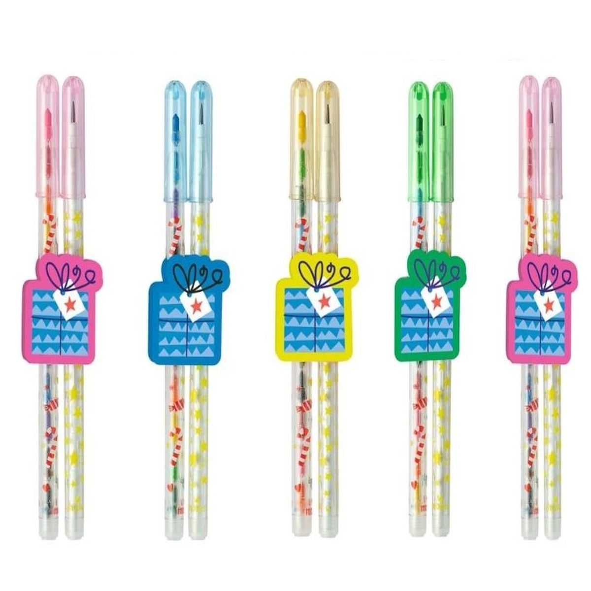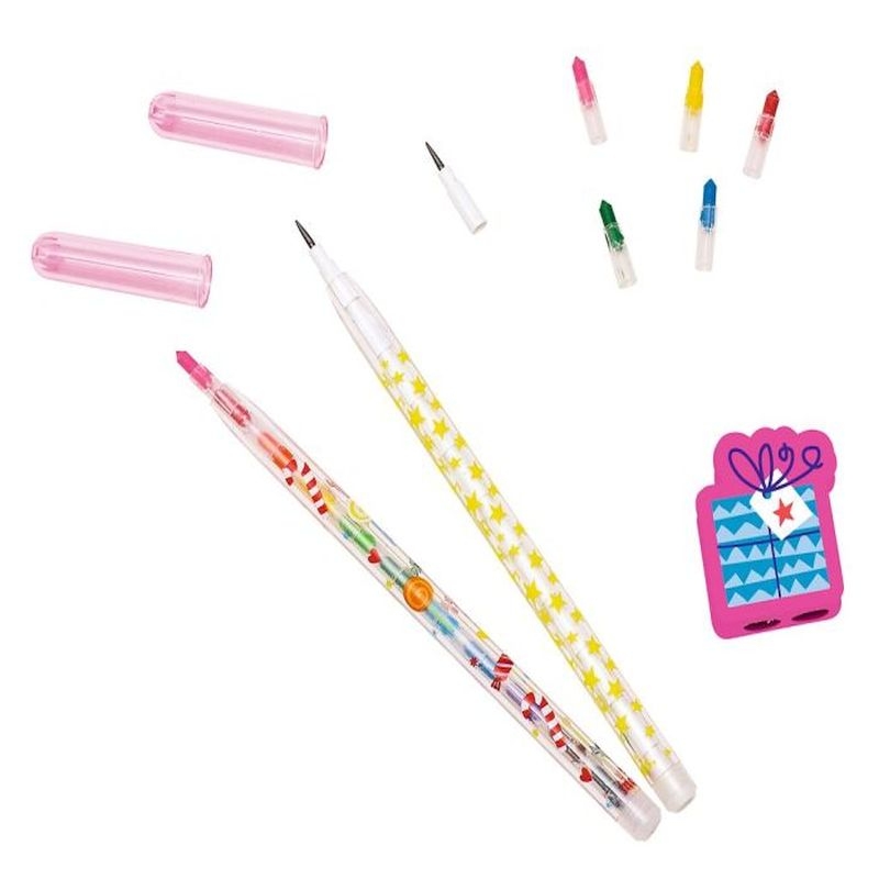 Γράψιμο, ζωγραφική, σβήσιμο – όλα σε ένα! Τα πολύχρωμα μολύβια είναι πραγματικά πολυεργαλεία. Αλλάζοντας τις πολύχρωμες μύτες κηρομπογιάς ή την κλασική μύτη μολυβιού μπορείτε να τα χρησιμοποιήσετε είτε για γραφή, είτε ως κηρομπογιές για δημιουργικές ζωγραφιές. Η μύτη τους απλώς εφαρμόζεται με “κούμπωμα”, χωρίς να χρειάζεται ξύσιμο, ιδανικά για ατελείωτη δημιουργική απασχόληση. Τα μολύβια είναι τοποθετημένα μέσα σε σβήστρα σε σχήμα δώρου!