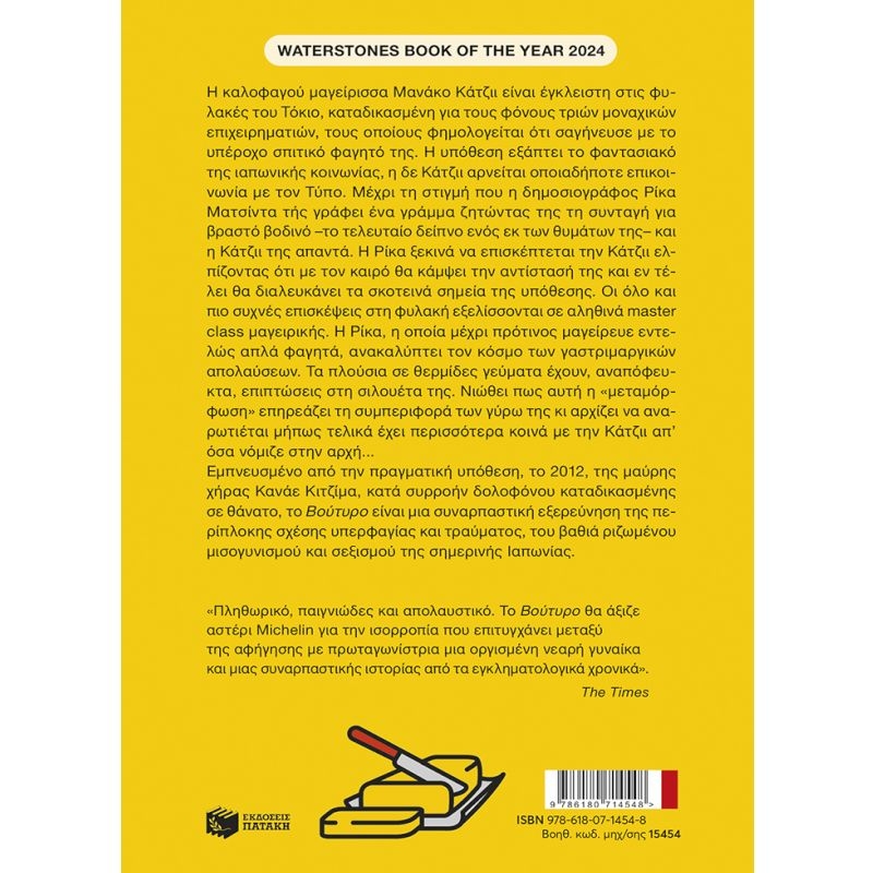 Η καλοφαγού μαγείρισσα Μανάκο Κάτζιι είναι έγκλειστη στις φυλακές του Τόκιο, καταδικασμένη για τους φόνους τριών μοναχικών επιχειρηματιών, τους οποίους φημολογείται ότι σαγήνευσε με το υπέροχο σπιτικό φαγητό της. Η υπόθεση εξάπτει το φαντασιακό της ιαπωνικής κοινωνίας, η δε Κάτζιι αρνείται οποιαδήποτε επικοινωνία με τον Τύπο. Μέχρι τη στιγμή που η δημοσιογράφος Ρίκα Ματσίντα τής γράφει ένα γράμμα ζητώντας της τη συνταγή για βραστό βοδινό –το τελευταίο δείπνο ενός εκ των θυμάτων της– και η Κάτζιι της απαντά. Η Ρίκα ξεκινά να επισκέπτεται την Κάτζιι ελπίζοντας ότι με τον καιρό θα κάμψει την αντίστασή της και εν τέλει θα διαλευκάνει τα σκοτεινά σημεία της υπόθεσης. Οι όλο και πιο συχνές επισκέψεις στη φυλακή εξελίσσονται σε αληθινά master class μαγειρικής. Η Ρίκα, η οποία μέχρι πρότινος μαγείρευε εντελώς απλά φαγητά, ανακαλύπτει τον κόσμο των γαστριμαργικών απολαύσεων. Τα πλούσια σε θερμίδες γεύματα έχουν, αναπόφευκτα, επιπτώσεις στη σιλουέτα της. Νιώθει πως αυτή η «μεταμόρφωση» επηρεάζει τη συμπεριφορά των γύρω της κι αρχίζει να αναρωτιέται μήπως τελικά έχει περισσότερα κοινά με την Κάτζιι απ’ όσα νόμιζε στην αρχή…Εμπνευσμένο από την πραγματική υπόθεση, το 2012, της μαύρης χήρας Κανάε Κιτζίμα, κατά συρροήν δολοφόνου καταδικασμένης σε θάνατο, το Βούτυρο είναι μια συναρπαστική εξερεύνηση της περίπλοκης σχέσης υπερφαγίας και τραύματος, του βαθιά ριζωμένου μισογυνισμού και σεξισμού της σημερινής Ιαπωνίας. «Πληθωρικό, παιγνιώδες και απολαυστικό. Το Βούτυρο θα άξιζε αστέρι Michelin για την ισορροπία που επιτυγχάνει μεταξύ της αφήγησης με πρωταγωνίστρια μια οργισμένη νεαρή γυναίκα και μιας συναρπαστικής ιστορίας από τα εγκληματολογικά χρονικά».