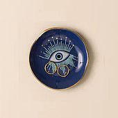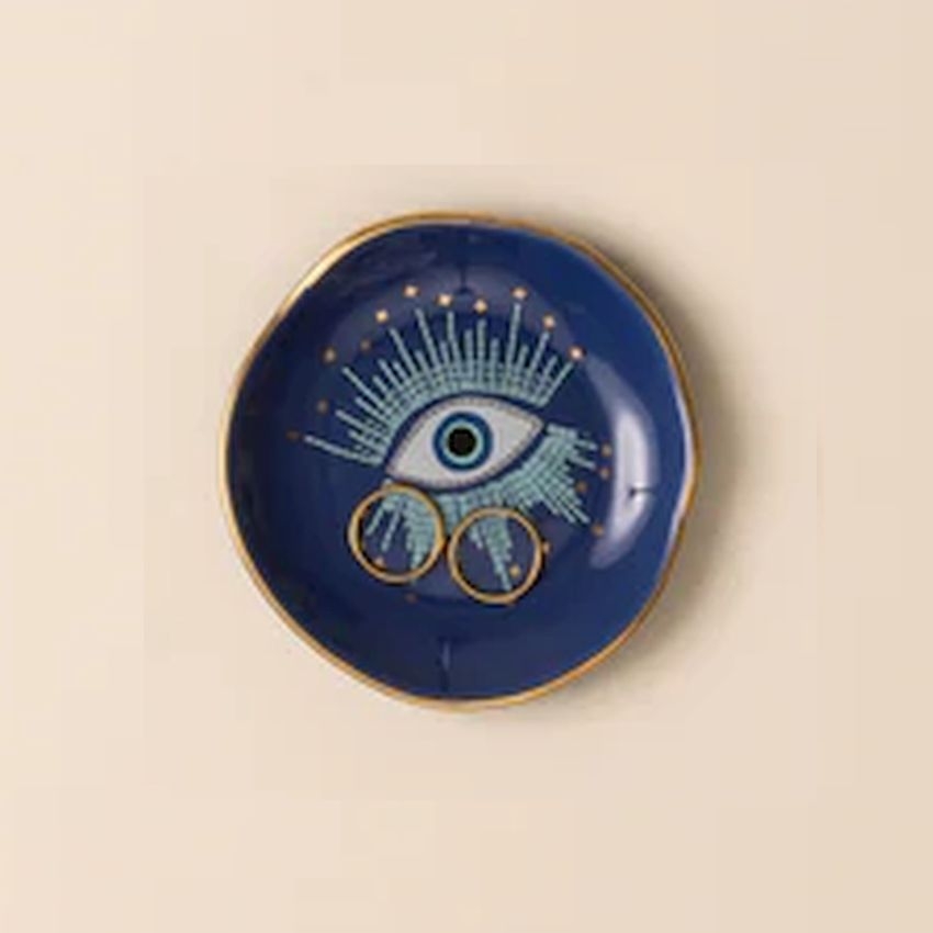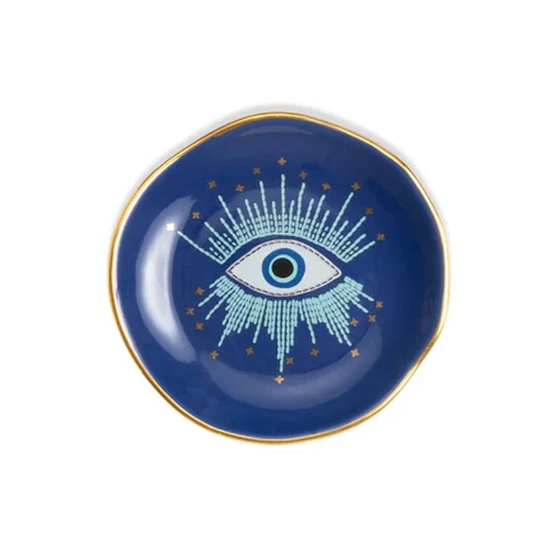 Αν το πρώτο πράγμα που κάνετε όταν γυρίσετε σπίτι είναι να βγάλετε τα δαχτυλίδια και τα σκουλαρίκια σας και να αδειάσετε τις τσέπες σας με κέρματα, είναι καλύτερο να ξέρετε σε ποιον να τα εμπιστευτείτε μέχρι αύριο: το Starry Eyed Trinket Dish είναι το ιδανικό μέρος για να τα αφήσετε με ασφάλεια και στυλ μέχρι να τα χρειαστείτε ξανά. Με μπλε απόχρωση και ένα λαμπερό μάτι, αυτό το πιατάκι προσθέτει μαγεία και κομψότητα στην είσοδο, το κομοδίνο ή το μπάνιο σας. Οι λεπτομέρειες από χρυσό foil και η χειροποίητη αισθητική του το καθιστούν ένα μικρό έργο τέχνης που συνδυάζει λειτουργικότητα και διακόσμηση.