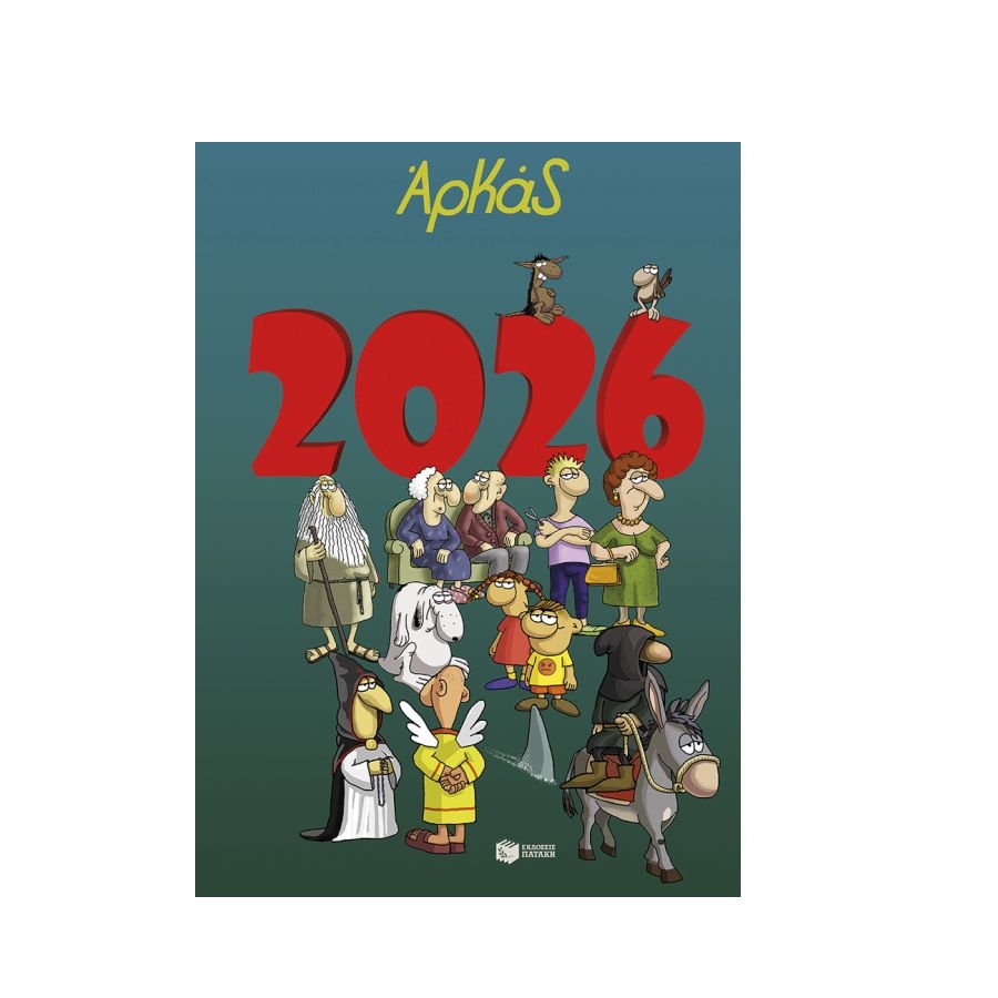 Οι αγαπημένοι ήρωες του Αρκά κατοικούν τις μέρες του ημερολογίου του για το 2026 και συνομιλούν με τον χρόνο που περνά: ο Θανασάκης, η Ρόζα κι η παρέα τους, η Ασημίνα κι ο Ναπολέων, τα έξυπνα πουλιά, οι ένοικοι της Zωής μετά, οι ηρωίδες του Μαλλί με μαλλί και οι κάτοικοι των Επικίνδυνων νερών, ο Προφήτης, αλλά και ο Ισοβίτης, ενώ ο Νώε περιμένει πάντα τη βροχή. Και μας θυμίζουν κάθε μέρα πόσο σπουδαίο αντίδοτο είναι στη ζωή το ευφυές χιούμορ.
