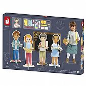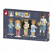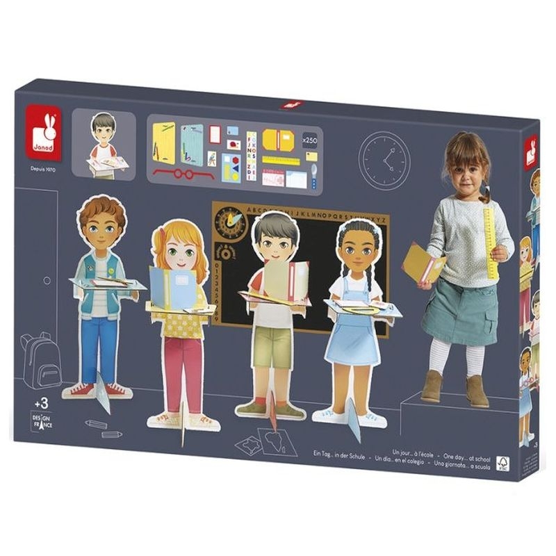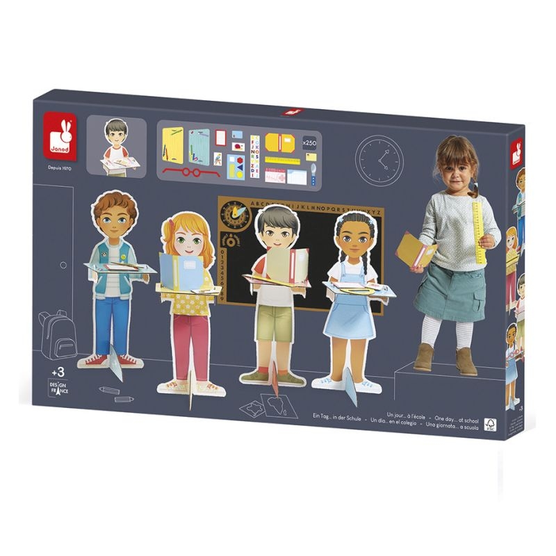 Σταματήστε την κουβέντα και πιάστε τα βιβλία των ασκήσεων! Δώστε την ευκαιρία στο μικρό σας να υποδυθεί τον ρόλο του αγαπημένου του δασκάλου, χάρη σ’ αυτό το εντυπωσιακό παιχνίδι με τους 4 χαρακτήρες που έχουν ύψος 65 εκ. Το παιδί σας θα έχει την ευκαιρία να αναπαραστήσει την αίθουσα της τάξης του με τη βοήθεια του μαυροπίνακα και των κιμωλιών, των μαθητών, που κάθονται στα θρανία τους με τα σχολικά σύνεργα στο χέρι έτοιμοι για τα μαθήματα γεωγραφίας, με τους χάρτες του κόσμου. Ακολουθεί η βιολογία, όπου οι μαθητές μπορούν να μάθουν για το ανθρώπινο σώμα και άλλα πράγματα, χάρη στο αλφαβητάρι και τις κάρτες με τα ζώα… Ααα, σαν να ακούσαμε το κουδούνι για διάλειμμα; Με μια κίνηση του χεριού, τα θρανία αναποδογυρίζουν και γίνονται δίσκοι της σχολικής τραπεζαρίας. Το παιδί σας θα έχει τη χαρά να σερβίρει τους συμμαθητές του με τον δίσκο σερβιρίσματος και τις 48 κάρτες φαγητού. Μόλις τελειώσει το μεσημεριανό, είναι ώρα για τα μαθηματικά: «Βγάλτε τους χάρακες και τα μοιρογνωμόνια!» Το σετ περιλαμβάνει ένα σύνολο από 250 αξεσουάρ για πολλές ώρες παιχνιδιού. Ιδανικό για την ανάπτυξη της φαντασίας και του μοιράσματος. Παιχνίδι μίμησης κατασκευασμένο από ξύλο και χαρτόνι, πιστοποιημένο από το Συμβούλιο Διαχείρισης των Δασών (FSCTM).