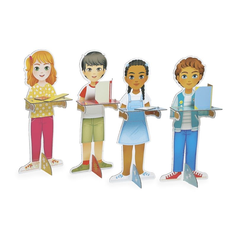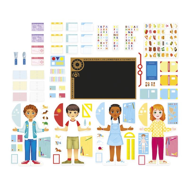 Περιλαμβάνονται: 4 εικονογραφημένες φιγούρες που στήνονται όρθιες, πολλά μικρά αξεσουάρ τάξης περίπου 250 χαρτονένια κομμάτια, ένας πίνακας τάξης για σκηνικά παιχνιδιού και οδηγίες παιχνιδιού.
