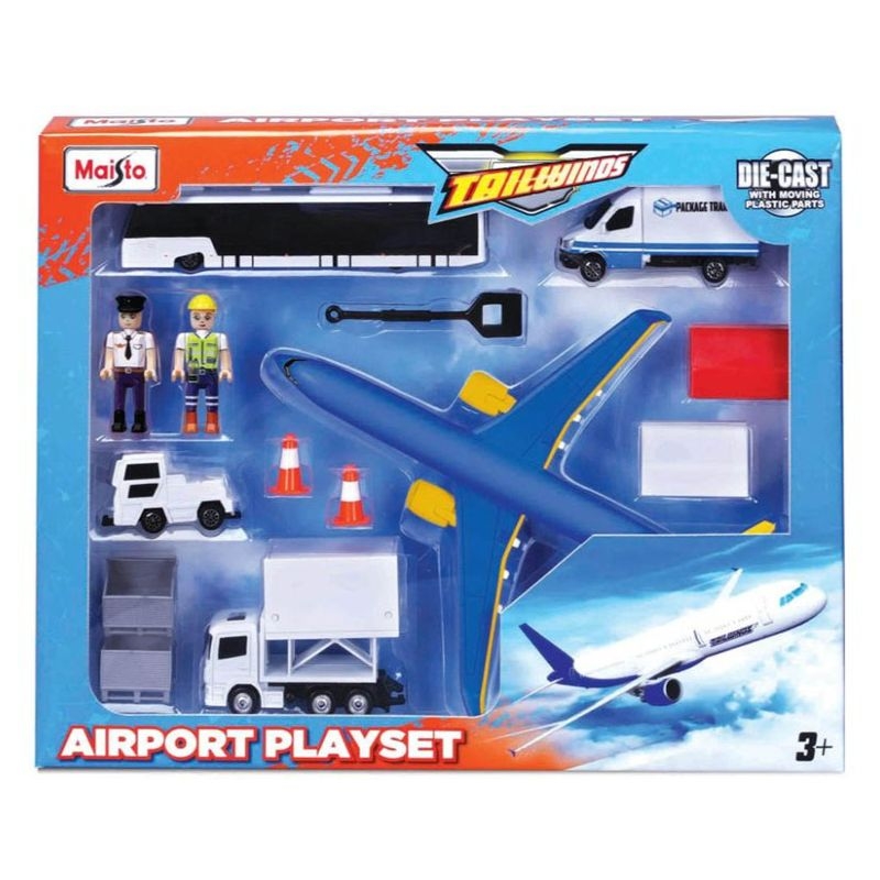 Περιλαμβάνει: Αεροπλάνο, Οχήματα διαχείρισης αποσκευών & φορτίου (με trailers), Λεωφορείο μεταφοράς επιβατών, Φορτηγάκι μεταφορών και 2 φιγούρες.