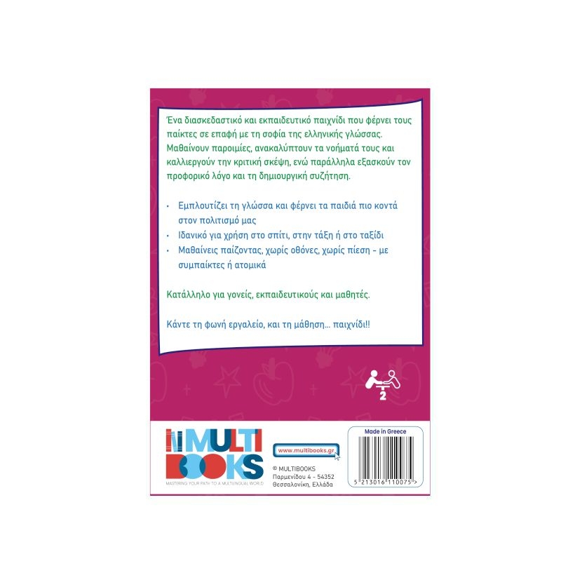 Η θεματική ενότητα Mini Flashcards - Παροιμίες φέρνει τους παίκτες σε επαφή με τη σοφία της ελληνικής γλώσσας. Μαθαίνουν παροιμίες, ανακαλύπτουν τα νοήματά τους και καλλιεργούν την κριτική σκέψη, ενώ παράλληλα εξασκούν τον προφορικό λόγο και τη δημιουργική συζήτηση.