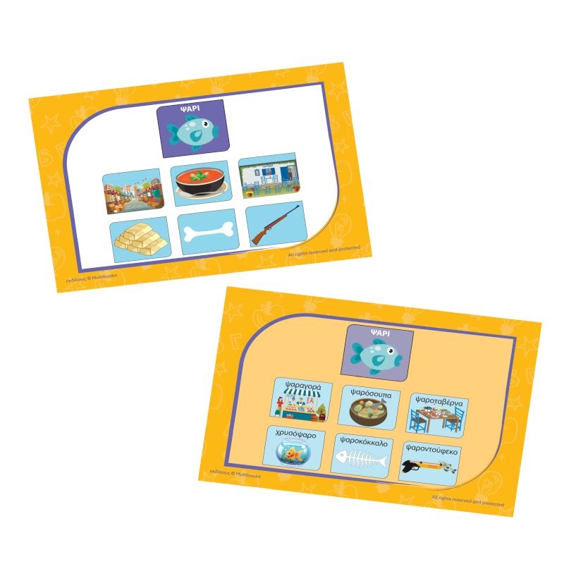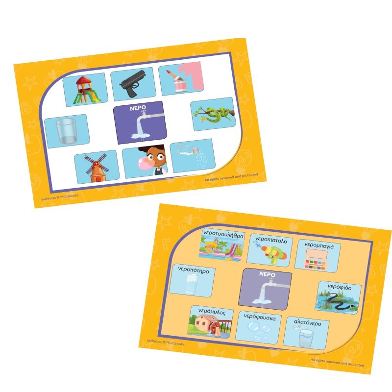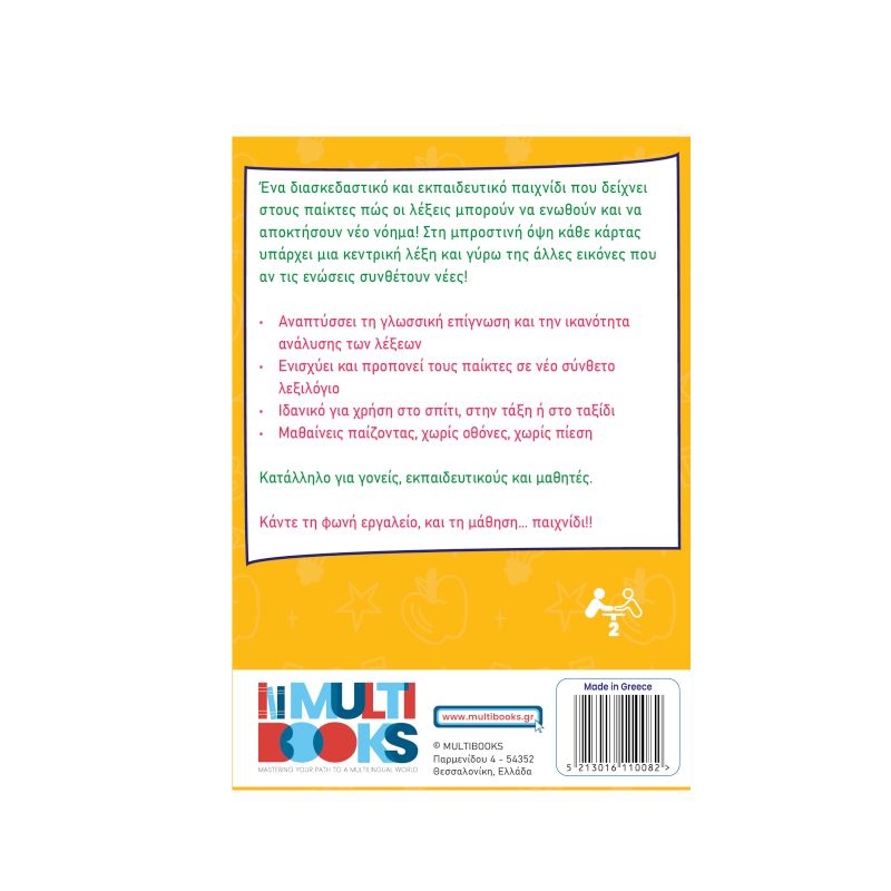 Η θεματική ενότητα Mini Flashcards – Σύνθετες λέξεις δείχνει στους παίκτες πώς οι λέξεις μπορούν να ενωθούν και να αποκτήσουν νέο νόημα! Στη μπροστινή όψη κάθε κάρτας υπάρχει μια κεντρική λέξη και γύρω της άλλες εικόνες που αν τις ενώσεις συνθέτουν νέες!