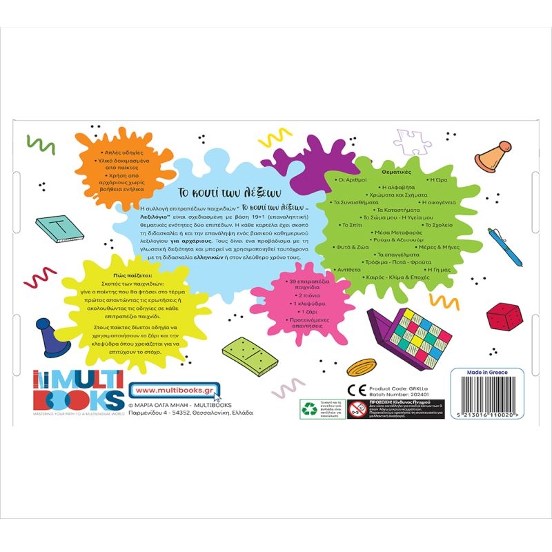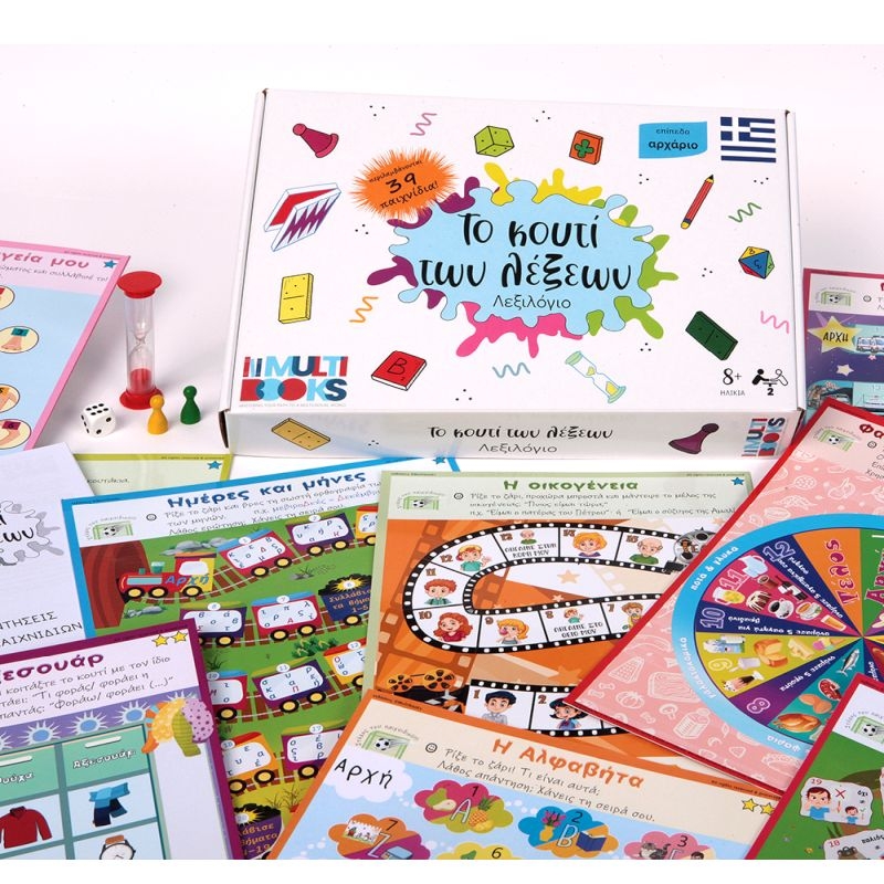 Το κουτί των λέξεων είναι επιτραπέζιο παιχνίδι για εκμάθηση λεξιλογίου το οποίο περιέχει 39 επιτραπέζια παιχνίδια με θεματικό λεξιλόγιο. Διασκέδασε μαθαίνοντας στο σχολείο ή στο σπίτι, με γονείς ή συμμαθητές. Βρες ένα συμπαίκτη και ξεκίνα να παίζεις το επιτραπέζιο παιχνίδι στα αγγλικά για να θυμηθείς ή να μάθεις με αστείο τρόπο το θεματικό λεξιλόγιο. Θα σε βοηθήσει να βελτιώσεις το λεξιλόγιό σου παίζοντας πάνω σε 19 θεματικές ενότητες και μία επαναληπτική.