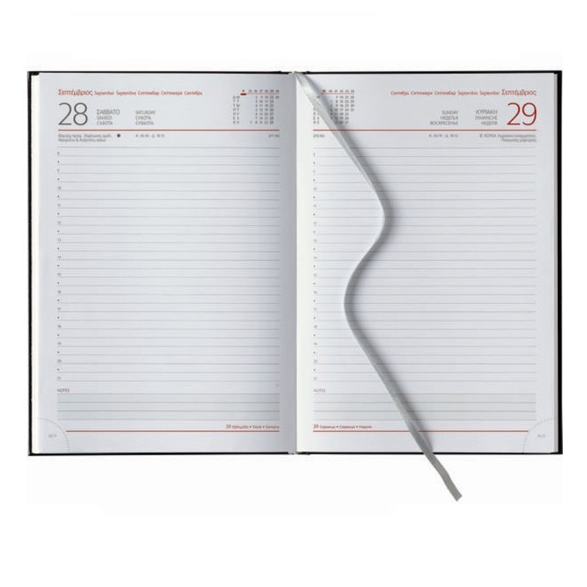 Ημερήσιο ημερολόγιο Page-a-Day με πλήρη σελίδα για κάθε ημέρα και ξεχωριστή σελίδα για Σάββατο και Κυριακή, για ακόμα καλύτερη οργάνωση του προγράμματος. Το κάλυμμα διαθέτει εκλεπτυσμένη, υφασμάτινη υφή τύπου Kashmir, προσφέροντας κομψότητα, αντοχή και ευχάριστη αίσθηση στο χέρι. Ένα πρακτικό και καλαίσθητο ημερολόγιο, ιδανικό για καθημερινή χρήση τόσο στο γραφείο όσο και στις προσωπικές σας σημειώσεις.