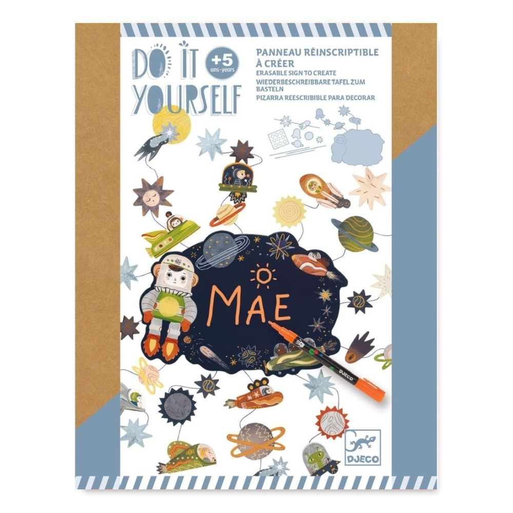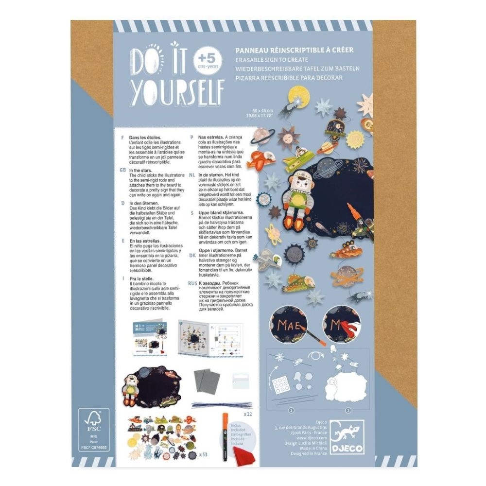 Ένα φανταστικό δημιουργικό σετ DIY της εταιρείας Djeco με θέμα το διάστημα, ιδανικό για μικρούς εξερευνητές που λατρεύουν να φτιάχνουν και να διακοσμούν! Τα παιδιά χρησιμοποιούν τα χρωματιστά, ημιάκαμπτα ραβδάκια και τα παχιά αυτοκόλλητα για να στερεώσουν τις φιγούρες πάνω στον πίνακα και να δημιουργήσουν ένα εντυπωσιακό διαστημικό σκηνικό που μπορούν να διακοσμούν και να ξαναχρησιμοποιούν ξανά και ξανά. Η επιφάνεια του πίνακα είναι ανθεκτική στις γρατζουνιές και σβήνεται εύκολα, χάρη στον ειδικό μαρκαδόρο "γράψε - σβήσε" και το πανάκι που περιλαμβάνονται στη συσκευασία. Ένα πρωτότυπο αντικείμενο που συνδυάζει δημιουργικότητα και λειτουργικότητα!