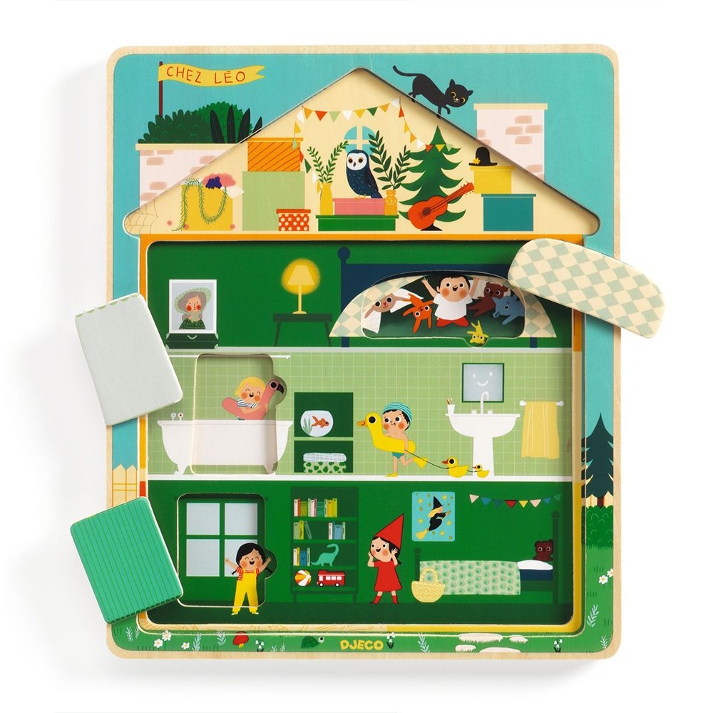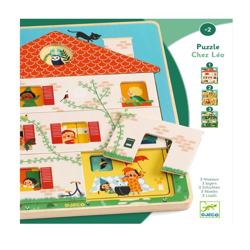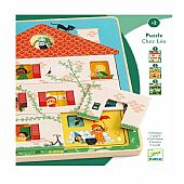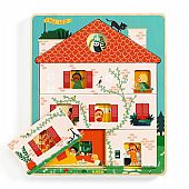 Ξύλινο παζλ 12 κομματιών της εταιρείας Djeco, χωρισμένο σε 3 επίπεδα. Κάθε όροφος του σπιτιού είναι ένα ξεχωριστό παζλ με διαφορετικό χρώμα, βοηθώντας τα παιδιά να αναγνωρίζουν και να τοποθετούν σωστά τα κομμάτια. Καθώς συναρμολογούν το σπίτι, ανακαλύπτουν σκηνές από την καθημερινή ζωή των παιδιών που ζουν μέσα σε αυτό. Τα μεγάλα κομμάτια είναι ιδανικά για μικρά χεράκια, ενώ το παιχνίδι ενισχύει τη λεπτή κινητικότητα, τη λογική σκέψη και την οπτική αντίληψη.