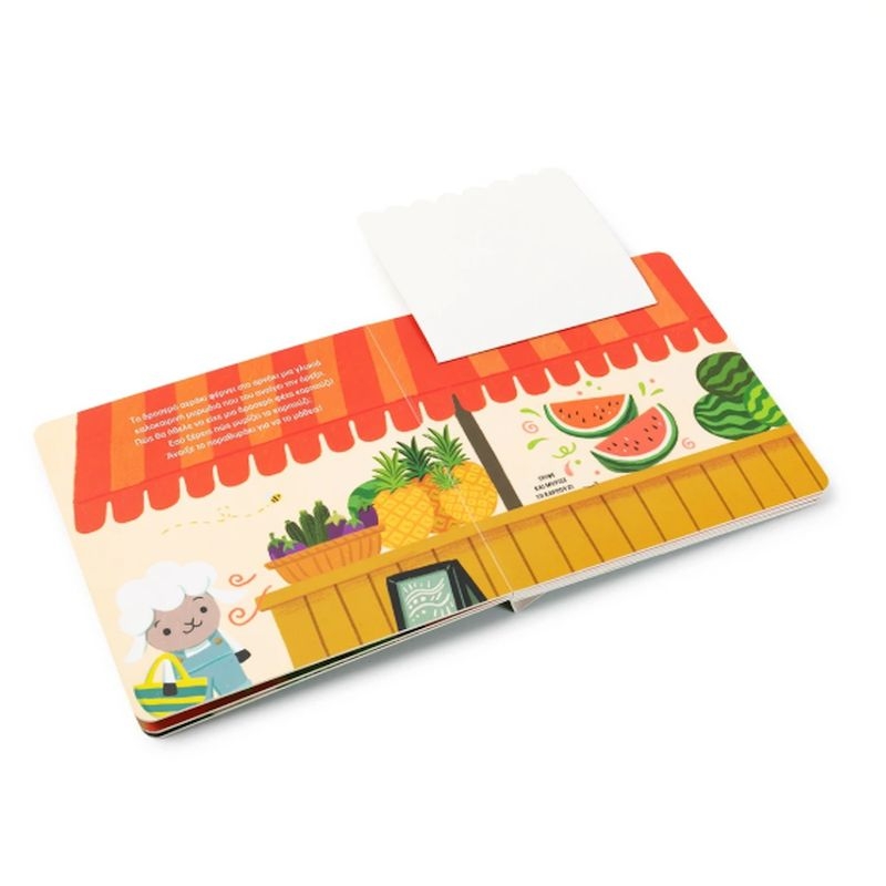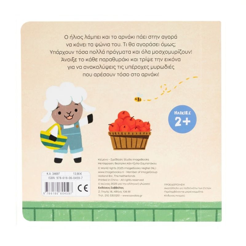 Ο ήλιος λάμπει και το αρνάκι πάει στην αγορά να κάνει τα ψώνια του. Τι θα αγοράσει όμως; Υπάρχουν τόσα πολλά πράγματα και όλα μοσχομυρίζουν! Άνοιξε το κάθε παραθυράκι και τρίψε την εικόνα για να ανακαλύψεις τις υπέροχες μυρωδιές που αρέσουν τόσο στο αρνάκι!