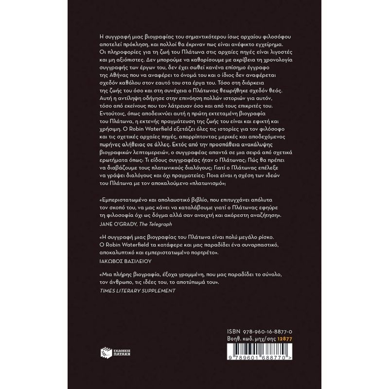 «Η συγγραφή μιας βιογραφίας του Πλάτωνα είναι πολύ μεγάλο ρίσκο. Ο Robin Waterfield τα κατάφερε και μας παραδίδει ένα συναρπαστικό, αποκαλυπτικό και εμπεριστατωμένο πορτρέτο». ΙΑΚΩΒΟΣ ΒΑΣΙΛΕΙΟΥ