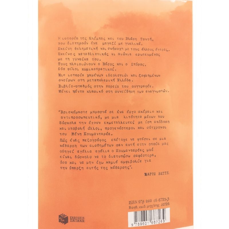 Η ιστορία της Μπέµπας και του Βλάση Ταντή, που διατηρούν ένα µαγαζί µε γυαλικά. Εκείνη θεληµατική και ανήσυχη µε τους άλλους άντρες. Εκείνος καταθλιπτικός κι αιώνια ερωτευµένος µε τη γυναίκα του. Τους πλαισιώνουν ο Βάσος και ο Σπύρος, δύο φίλοι κωµικοτραγικοί. Μια ιστορία χαµένων ιδεολογιών και ξοφληµένων ονείρων στη µεταπολεµική Ελλάδα. Βιβλίο-σταθµός στην πορεία του συγγραφέα. Μένει πάντα κλασικό στη συνείδηση των αναγνωστών. «Βρισκόµαστε µπροστά σε ένα έργο ακέραιο και αντιπροσωπευτικό, µε µια λιτότητα µέσων που δύσκολα την έχουν εκµεταλλευτεί µε ίση απόδοση και υποβολή άλλοι, προγενέστεροι και σύγχρονοι του Μένη Κουµανταρέα. Πώς ένας πεζογράφος επέτυχε να φτάσει σε µια κάθαρση των αισθηµάτων σαν αυτή στην οποία µας οδηγεί αγάλια αγάλια ο Κουµανταρέας µού είναι δύσκολο να το διατυπώσω σαφέστερα, όσο και να µην έχω καµιάαµφιβολία για την ύπαρξη αυτής της κάθαρσης».
