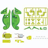 Περιλαμβάνει: έκκεντρο x 2, αριστερό μάτι, δεξί μάτι, πίσω πόδι x 2, μπροστινό πόδι x 2, δεξί μπροστινό πόδι, δεξί πίσω πόδι, αριστερό μπροστινό πόδι, αριστερό πίσω πόδι ράβδος ματιών, καπάκι ακροδέκτη x 2, αριστερό μέρος σώματος, δεξί μέρος σώματος, αριστερό μέρος κεφαλιού, δεξί μέρος κεφαλιού, αριστερός σύνδεσμος, δεξιός σύνδεσμος, θήκη μπαταριών, κάλυμμα μπαταριών με βίδα, κινητήρας, μοχλός, κάλυμμα κινητήρα, βολβός ματιού x 2, πλάκα ανύψωσης, βίδα με ροδέλα x 9, βίδα x 6, οδηγίες στα Ελληνικά.