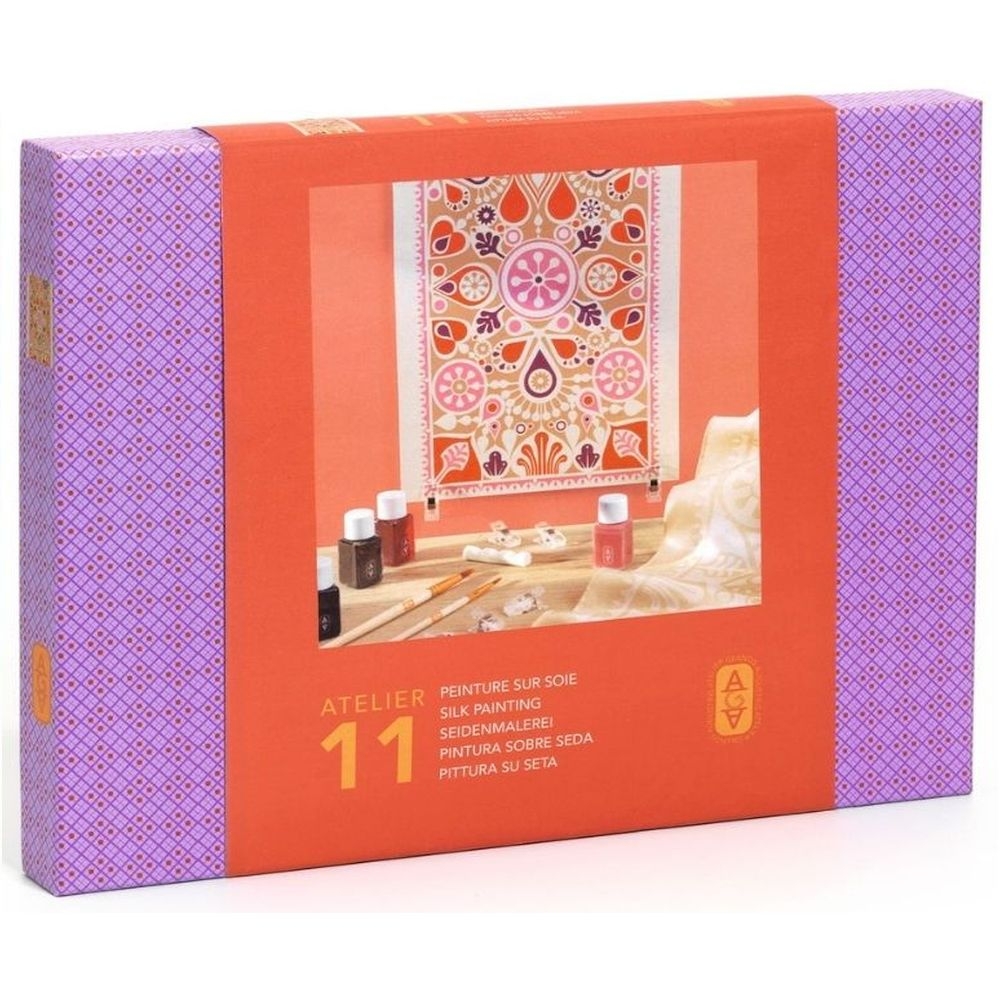Σετ ζωγραφικής σε μετάξι Atelier 11 από την εταιρεία Djeco, για να δημιουργήσετε με τα χέρια σας ένα μοναδικό φουλάρι! Η τεχνική της ζωγραφικής σε μετάξι γίνεται εύκολη και απολαυστική, καθώς το ύφασμα διαθέτει ήδη διακριτικά περιγράμματα (gutta) που βοηθούν το χρώμα να απλωθεί χωρίς μουτζούρες. Δεν απαιτείται ακρίβεια, οι αποχρώσεις ρέουν ελεύθερα, δημιουργώντας κάθε φορά κάτι ξεχωριστό. Το σετ περιλαμβάνει όλα τα απαραίτητα υλικά, μαζί με βίντεο οδηγιών, ώστε να ακολουθήσετε τη διαδικασία βήμα-βήμα στον δικό σας ρυθμό. Μια ήρεμη δραστηριότητα που προσφέρει χαλάρωση και δημιουργικότητα, ιδανική για το σπίτι. Το φουλάρι που θα διακοσμήσετε μπορεί να φορεθεί ή να χαριστεί ως χειροποίητο δώρο, ενώ η συσκευασία είναι όμορφα διακοσμημένη και επαναχρησιμοποιήσιμη.