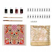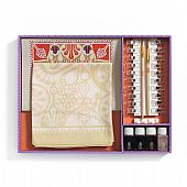 To σετ περιλαμβάνει: 1 φουλάρι από μετάξι (130 x 34 εκ.) με περίγραμμα, 20 κλιπ στερέωσης, 4 φιαλίδια χρώματος των 30 ml, 2 πινέλα και βάση στήριξης, 1 πατρόν, Φυλλάδιο και κάρτα με QR code για το βίντεο.