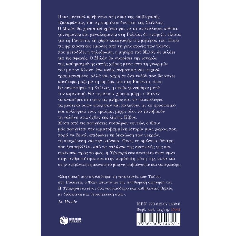 Ποια μυστικά κρύβονται στη σκιά της επιβλητικής τζακαράντας, του αγαπημένου δέντρου της Στέλλας; Ο Μιλάν θα χρειαστεί χρόνια για να τα ανακαλύψει καθότι, γεννημένος και μεγαλωμένος στη Γαλλία, δε γνωρίζει τίποτα για τη Ρουάντα, τη χώρα καταγωγής της μητέρας του. Παρά τις φρικιαστικές εικόνες από τη γενοκτονία των Τούτσι που μεταδίδει η τηλεόραση, η μητέρα του Μιλάν δε μιλάει για τις σφαγές. Ο Μιλάν θα γνωρίσει την ιστορία της καθημαγμένης αυτής χώρας μέσα από τη γνωριμία του με τον Κλοντ, ένα αγόρι σωματικά και ψυχικά τραυματισμένο, αλλά και χάρη σε ένα ταξίδι που θα κάνει αργότερα μαζί με τη μητέρα του στη Ρουάντα, όπου θα συναντήσει τη Στέλλα, η οποία γεννήθηκε μετά τον αφανισμό. Θα περάσουν χρόνια μέχρι ο Μιλάν να ανασύρει στο φως τις μνήμες και να αποκαλύψει τα μυστικά όσων επέζησαν και παλεύουν με το προσωπικό και συλλογικό τους τραύμα, μέχρι όλοι να ξαναβρούν τη γαλήνη στις όχθες της λίμνης Κίβου. Μέσα από τις αφηγήσεις τεσσάρων γενεών, ο Φάιγ μάς αφηγείται την αιματοβαμμένη ιστορία μιας χώρας που, παρά τα δεινά, επιδιώκει τη δικαίωση των νεκρών, τη συγχώρεση και την ομόνοια. Όπως το ομώνυμο δέντρο, που ξεπροβάλλει από τα σπλάχνα της σκοτεινής γης και υψώνεται προς το φως, η Τζακαράντα αποτελεί έναν ύμνο στην ανθρωπότητα και στην παράδοξη φύση της, αλλά και στην ανεξάντλητη ικανότητά μας να επιβιώνουμε και να αγαπάμε. «Στη σιωπή που ακολούθησε τη γενοκτονία των Τούτσι στη Ρουάντα, ο Φάιγ απαντά με την πληθωρική αφήγησή του. Η Τζακαράντα είναι ένα γενναιόδωρο και καθηλωτικό βιβλίο, με διδακτική και θεραπευτική αξία».