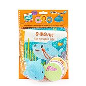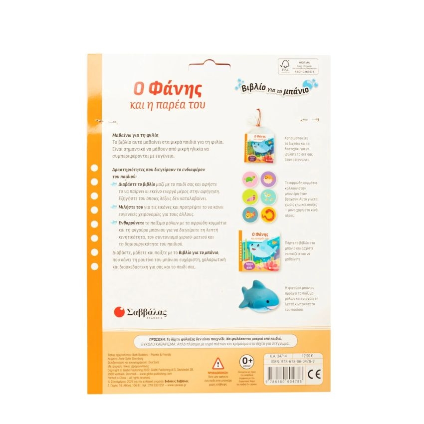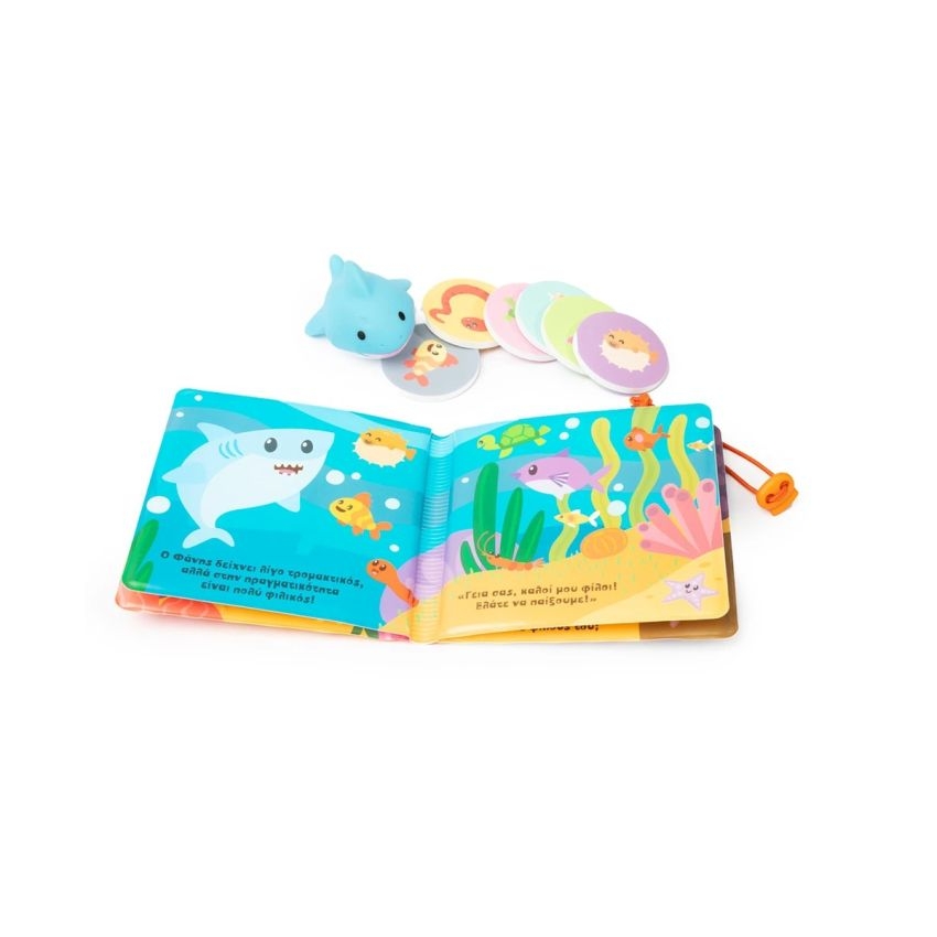 Το βιβλίο αυτό μαθαίνει στα μικρά παιδιά για τη φιλία. Είναι σημαντικό να μάθουν από μικρή ηλικία να συμπεριφέρονται με ευγένεια. Διαβάστε, μάθετε και παίξτε με το Βιβλίο για το μπάνιο, που κάνει τη ρουτίνα του μπάνιο ευχάριστη, χαλαρωτική και διασκεδαστική για σας και το παιδί σας: Χρησιμοποιείτε το διχτάκι και το λαστιχάκι για να φυλάτε το σετ σας όταν στεγνώνει. Τα αφρώδη κομμάτια κολλούν στην μπανιέρα όταν βραχούν. Αυτό γίνεται χωρίς χημικές ουσίες- μόνο χάρη στο κενό αέρος. Πάρτε το βιβλίο στο μπάνιο και αρχίστε να παίζετε και να μαθαίνετε. Η φιγούρα μπάνιου προάγει το παίξιμο ρόλων και ενισχύει τη λεπτή κινητικότητα του παιδιού.