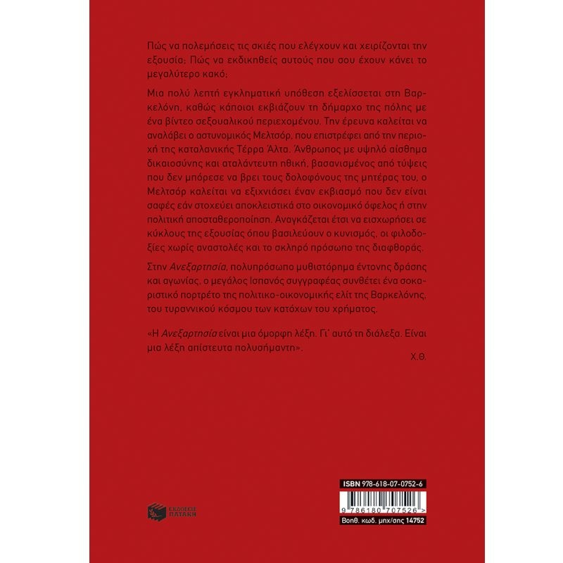 Πώς να πολεµήσεις τις σκιές που ελέγχουν και χειρίζονται την εξουσία; Πώς να εκδικηθείς αυτούς που σου έχουν κάνει το µεγαλύτερο κακό; Μια πολύ λεπτή εγκληµατική υπόθεση εξελίσσεται στη Βαρκελόνη, καθώς κάποιοι εκβιάζουν τη δήµαρχο της πόλης µε ένα βίντεο σεξουαλικού περιεχοµένου. Την έρευνα καλείται να αναλάβει ο αστυνοµικός Μελτσόρ, που επιστρέφει από την περιοχή της καταλανικής Τέρρα Άλτα. Άνθρωπος µε υψηλό αίσθηµα δικαιοσύνης και αταλάντευτη ηθική, βασανισµένος από τύψεις που δεν µπόρεσε να βρει τους δολοφόνους της µητέρας του, ο Μελτσόρ καλείται να εξιχνιάσει έναν εκβιασµό που δεν είναι σαφές εάν στοχεύει αποκλειστικά στο οικονοµικό όφελος ή στην πολιτική αποσταθεροποίηση. Αναγκάζεται έτσι να εισχωρήσει σε κύκλους της εξουσίας όπου βασιλεύουν ο κυνισµός, οι φιλοδοξίες χωρίς αναστολές και το σκληρό πρόσωπο της διαφθοράς. Στην «Ανεξαρτησία», πολυπρόσωπο µυθιστόρηµα έντονης δράσης και αγωνίας, ο µεγάλος Ισπανός συγγραφέας συνθέτει ένα σοκαριστικό πορτρέτο της πολιτικο-οικονοµικής ελίτ της Βαρκελόνης, του τυραννικού κόσµου των κατόχων του χρήµατος. «Η Ανεξαρτησία είναι µια όµορφη λέξη. Γι’ αυτό τη διάλεξα. Είναι µια λέξη απίστευτα πολυσήµαντη».