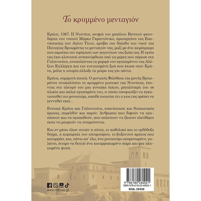 Κρήτη, 1367. Η Ντονάτα, ανιψιά του μεγάλου Βενετού φεουδάρχη του νησιού Μάρκο Γκραντόνικο, πρωτεργάτη της Επανάστασης του Αγίου Τίτου, κρύβει στο δάπεδο του ναού της Παναγίας Βρυωμένης το μενταγιόν της, μαζί με ένα χειρόγραφο που περιέχει την αφήγηση των γεγονότων της ζωής της. Η υγεία της έχει κλονιστεί ανεπανόρθωτα από τις μέρες που πέρασε στη Γαληνοτάτη, αναπολώντας τη μορφή του αγαπημένου της Αλέξιου Καλλέργη και την ευτυχισμένη ζωή που έχασε στην Κρήτη, μόλις η ιστορία άλλαξε τη μοίρα της για πάντα. Κρήτη, σημερινή εποχή. Ο μοναχός Φιλόθεος της μονής Βρυωμένου ανακαλύπτει το κρυμμένο μυστικό της Ντονάτας, έχοντας στο πλευρό του μια γυναίκα έγκυο, μεγαλύτερή του σε ηλικία και παλιά αγαπημένη του, η οποία αποφασίζει να εγκατασταθεί στο μοναστήρι, επειδή πιστεύει ότι ο γιος της πρέπει να γεννηθεί εκεί… Ενετική Κρήτη και Γαληνοτάτη, επανάσταση και θυσιαστικός έρωτας, παρελθόν και παρόν. Άνθρωποι που διψούν να αγαπήσουν και να αγαπηθούν, που παλεύουν να ζήσουν ελεύθεροι ώστε να μπορούν να ονειρεύονται. Και εν μέσω όλων αυτών η πίστη, το καθολικό και το ορθόδοξο δόγμα, η κυριαρχία του ισχυροτέρου, το βυζαντινό κράτος που καταρρέει, και, πάνω απ’ όλα, ένα μοναστήρι απομονωμένο, γαλήνιο, έτοιμο να δεχτεί ένα καταρρακωμένο σώμα και μια πληγωμένη ψυχή.